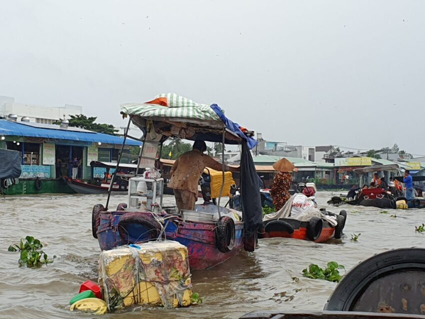 Um kurz vor sieben schlugen wir an unserem Bootsstand auf. Die Inhaberin wartete schon und verwies uns an ihre Bootsführerin. Wir kletterten über die Brüstung ins motorisierte Holzboot, das wir für drei Stunden unser eigen nennen sollten. Es hatte erfreulicherweise einen Regen(/Sonnen)schutz mit der Möglichkeit, die Seiten ebenfalls zuzuziehen. Gut so, es hatte morgens mal…