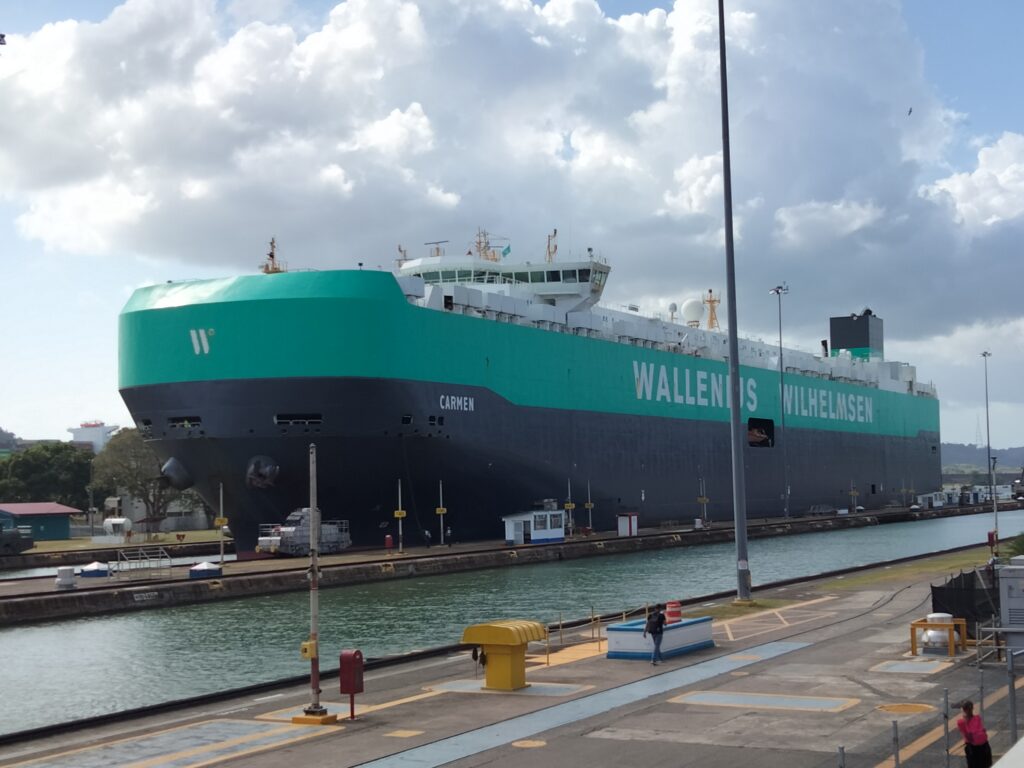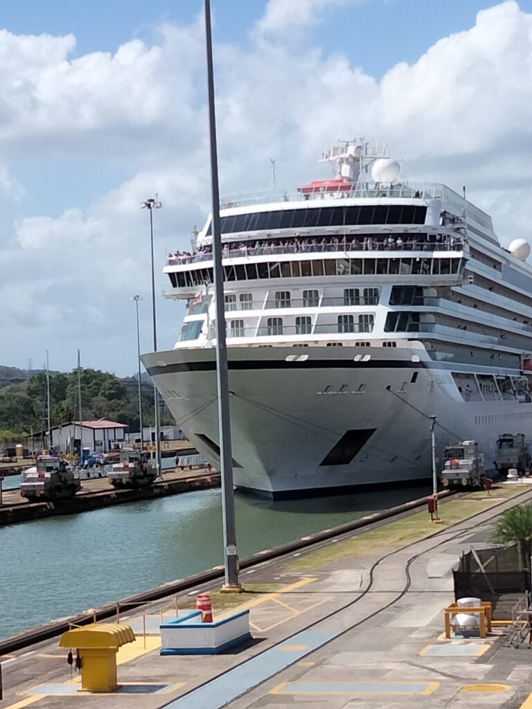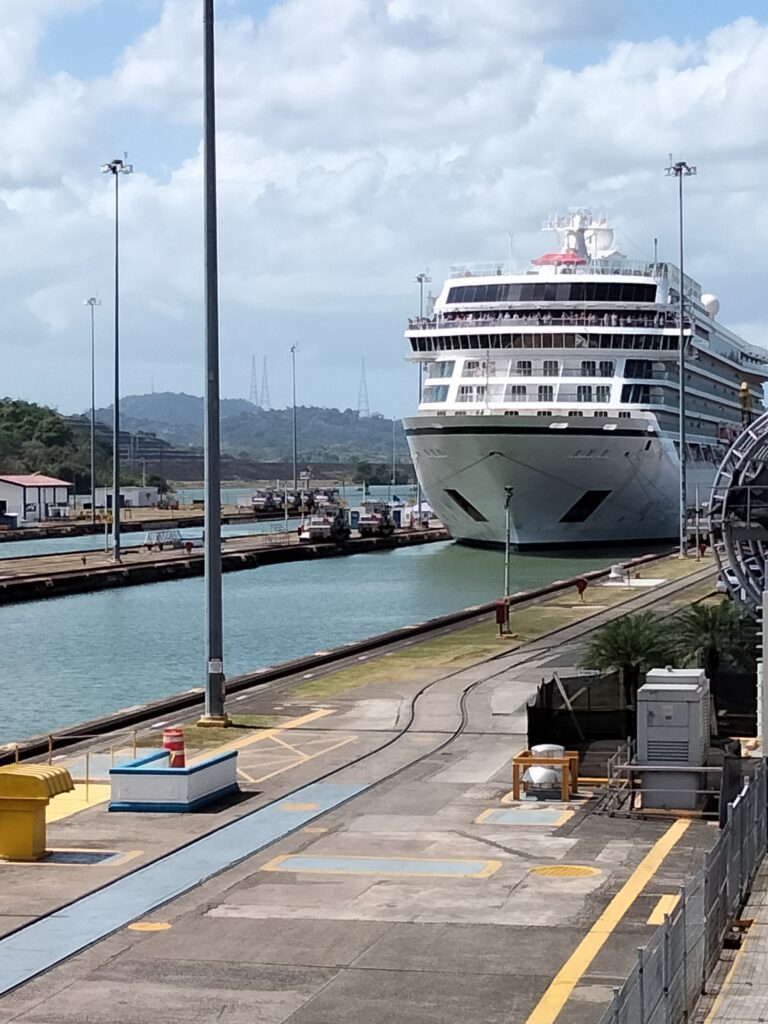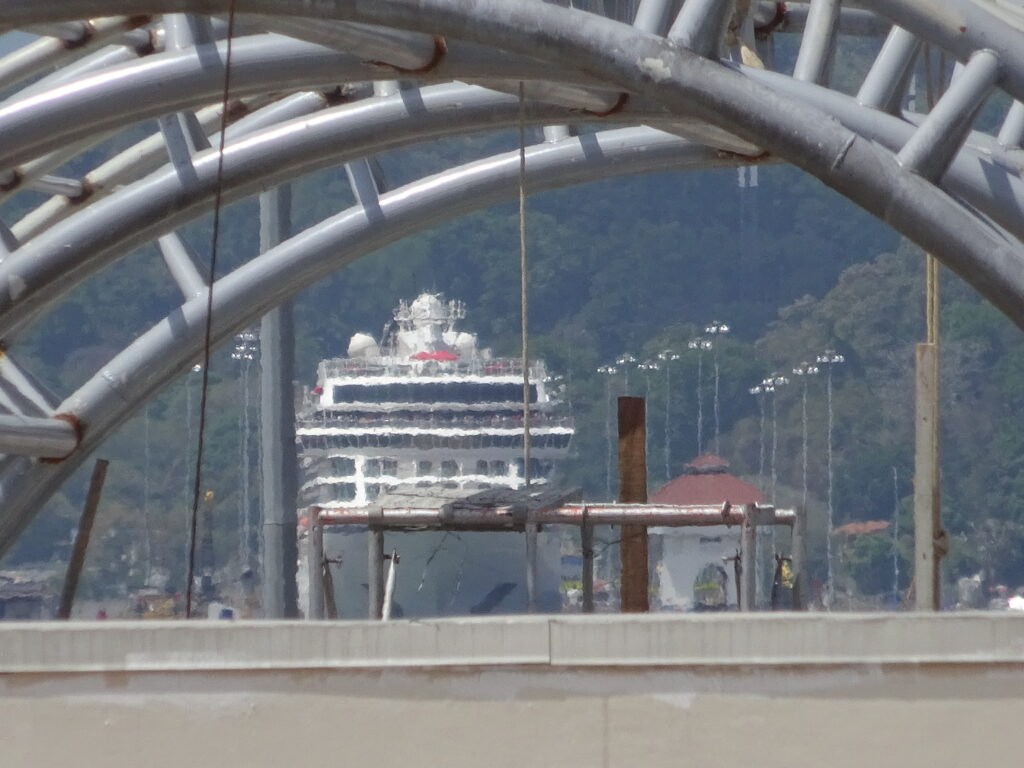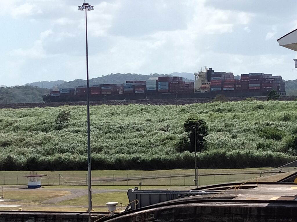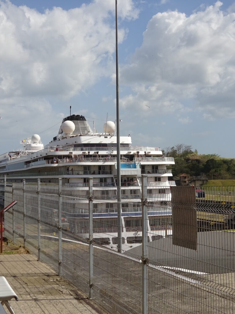 Wie ich dann anschließend feststellen durfte, war ich nun aber zu spät für zu schleusende Schiffe. Ein wenig darüber zuvor reflektiert und mir wäre vielleicht ein vielversprechender Gedanke in dieser Richtung gekommen. Schließlich ist klar, dass die Schiffe morgens in die eine Richtung und abends in die andere Richtung durch die Schleusen durchgeschleust werden müssen. Wie soll das sonst funktionieren? Aber schwamm drüber, Ferien im Kopf. Also saß ich um 12.15 auf der Minitribüne, um zu hören, dass gegen 2 Uhr das erste Schiff, ein Kreuzfahrtschiff, in Richtung Pazifik geschleust werden würde. Schnauf, sitzen und warten. Müde. Schläfrig. Heiß. Doch das Internet half, weil ich meine Überlegungen hinsichtlich meiner weiteren Reiseroute vorantreiben konnte.