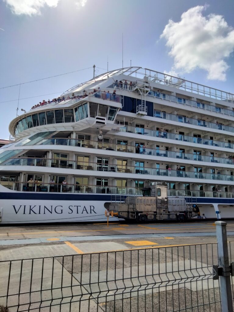 Nachdem das Kreuzfahrtschiff durch war, wurde es merklich leerer. Ich warte noch etwas und beobachtete den Container mit Autos u.ä. So riesig und überall geschlossen. Da wirkt das Schiff noch einmal größer. Letztlich war mir aber inztwischen doch verdammt heiß und ich wollte zurück. Meinen Plan, im stadteigenen Nationalpark herumzuspazieren, hatte ich schon begraben. Ein Blick auf die Uhr hatte Bände gesprochen. Also wollte ich mit dem Bus zurück, der auf sich warten ließ. Leider gibt es wohl nur wenige Turisten, die den Bus bevorzuegn. Dementsprechend fährt er nciht so häufig – alle 30 bis 45 min. In dieser Zeit staut sich dann etwas Mensch an und es wird eine volle Fahrt,zumindest am Nachmittag. Entsprechend bequem wurde es dann, obwohl ich zufrieden sein muss. Ich hatte den drittletzten Sitzplatz erobert und musste nur die Nähe einer Frau ertragen, die etwas über den für hiesige Verhältnisse allzu schmalen Sitzplatz ragte. Die Rückfahrt zog sich das Feierabendverkehrs hin…