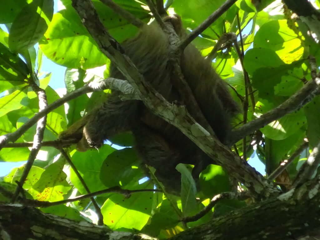 Nachmittags schlenderte ich zur Playa negra bei wieder herrlichem Sonnenschein und feuchter Wärme. Das Meer umspülte kräftig das bißchen Strand und ich suchte mir einen Baum, der über der Brandung ins Meer hineinragte. Ein Baum, der auch Faultieren gefällt, wie mir nach einiger Zeit in den Sinn kam. Daraufhin schaute ich mal nach links in den Nachbarbaum und fand dort doch tatsächlich ein schlummerndes Faultier. Zu meinem großen Glück hatte es wohl schon lange in dieser Gabel gelegen und veränderte seine Position der Sonne entgegen, so dass ich es bei seinem gigantischen Bewegungen von etwa 2 Metern filmen konnte! (Der Film wäre hier auch zu sehen, wenn Sony nicht ein proprietäres Format verwenden würde, das kein Programm abspielen oder formatieren kann. grrr!)