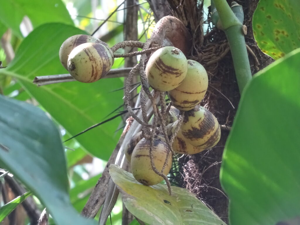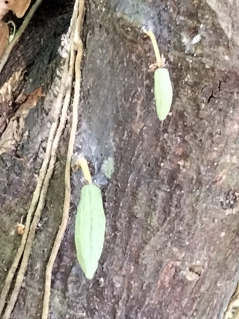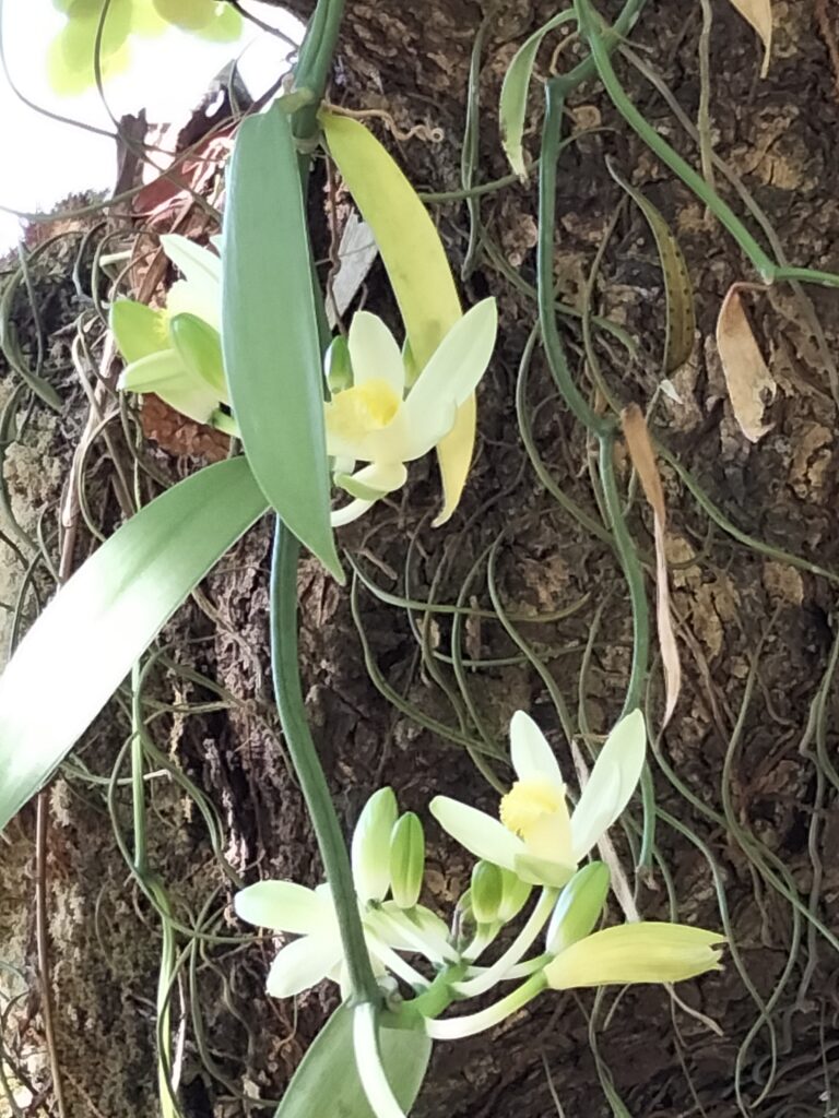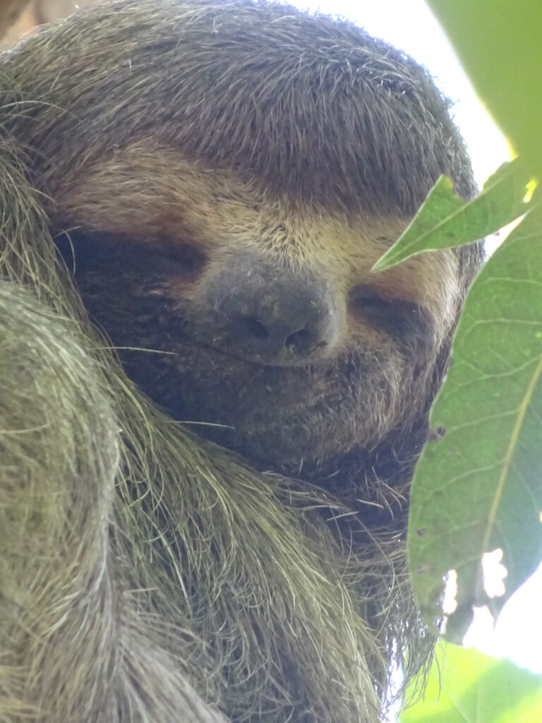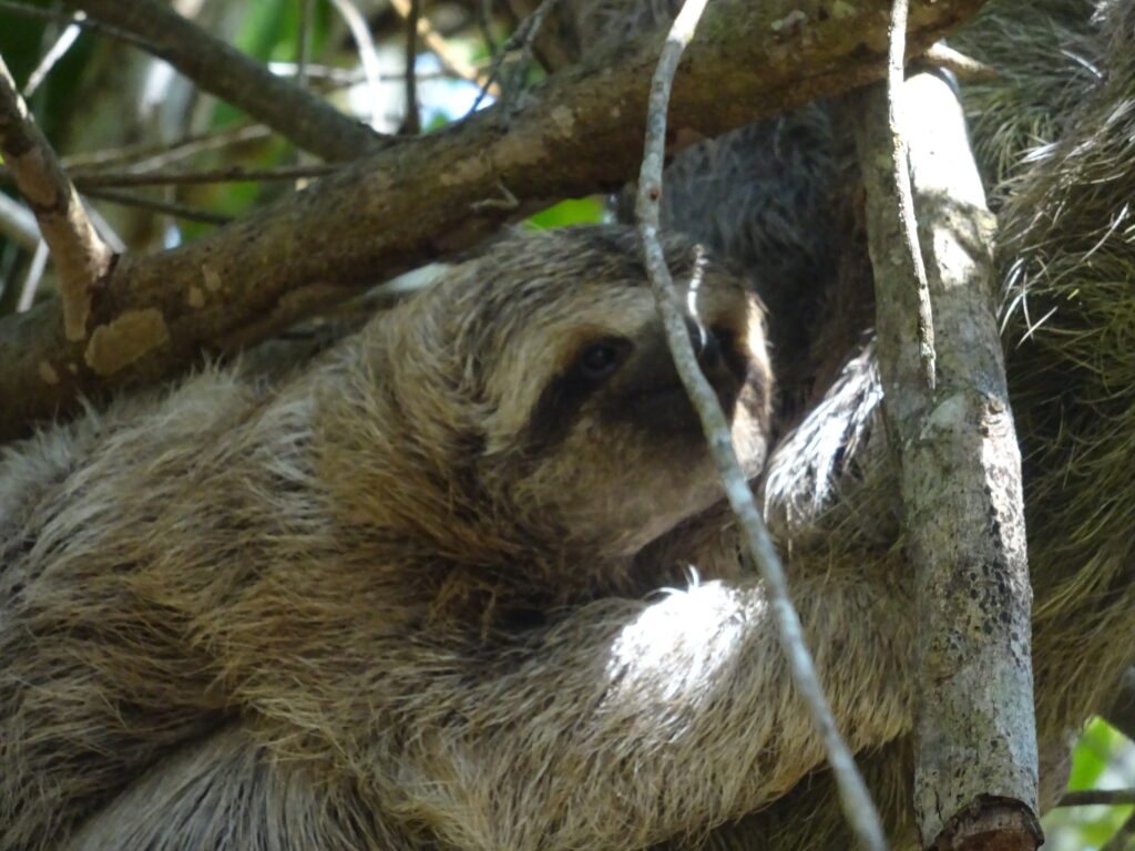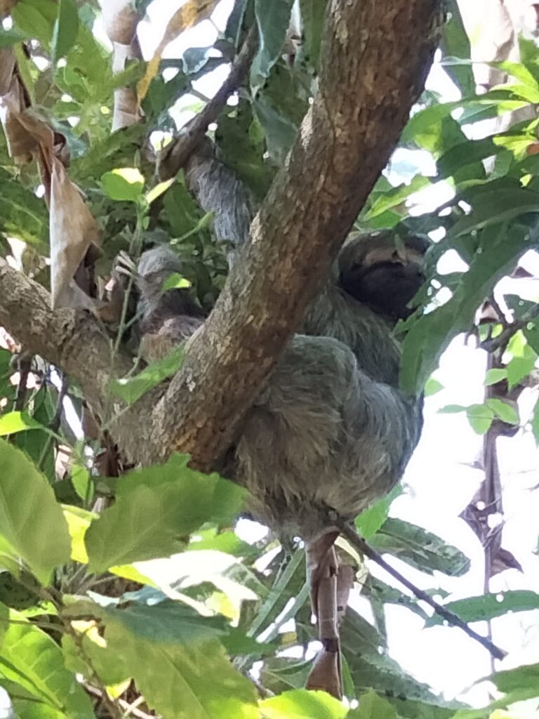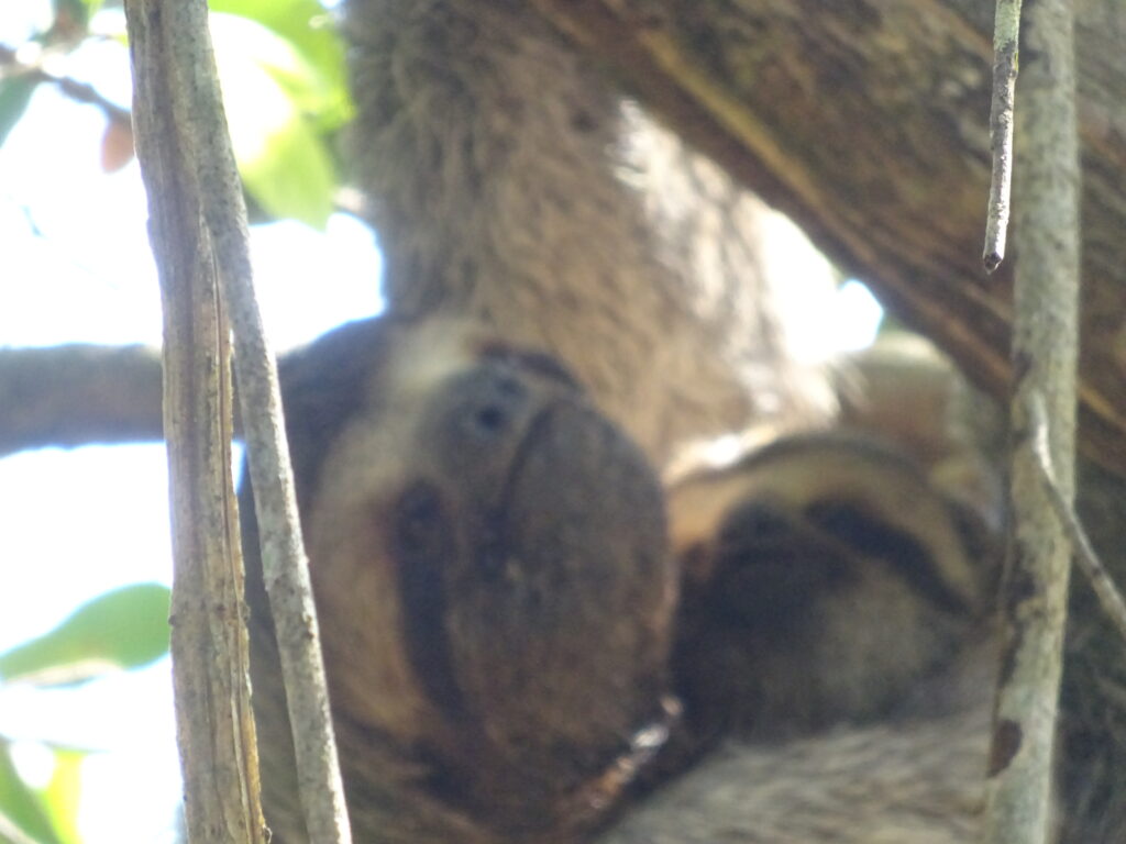Kaum waren wir angekommen, zeigte uns Armin, wie man Vanille bestäubt, denn es gab dort einige reife Blüten. Danach gingen wir einmal um die Hausecke und ein paar Schritte und trafen in einem höheren Strauch-Baum ein Dreifingerfaultier mit seinem Jungtier. Wegen der vielen Fotographen schien es doch etwas nervös zu sein, denn es BEWEGTE sich. Diese Tiere sind einfach toll.