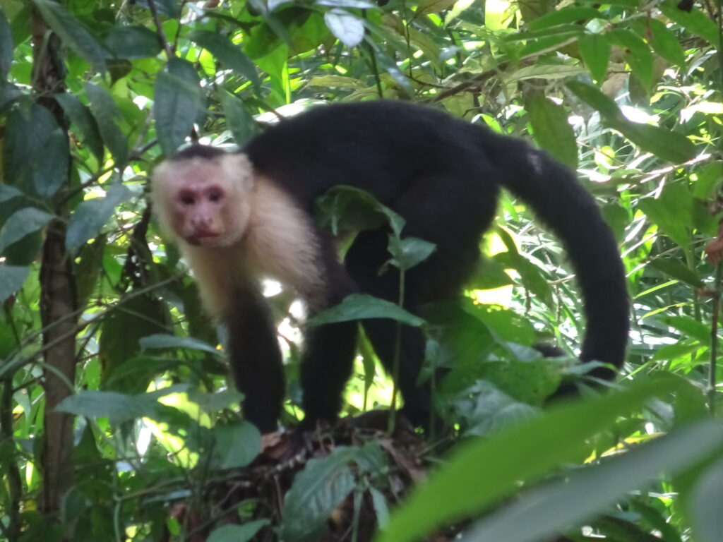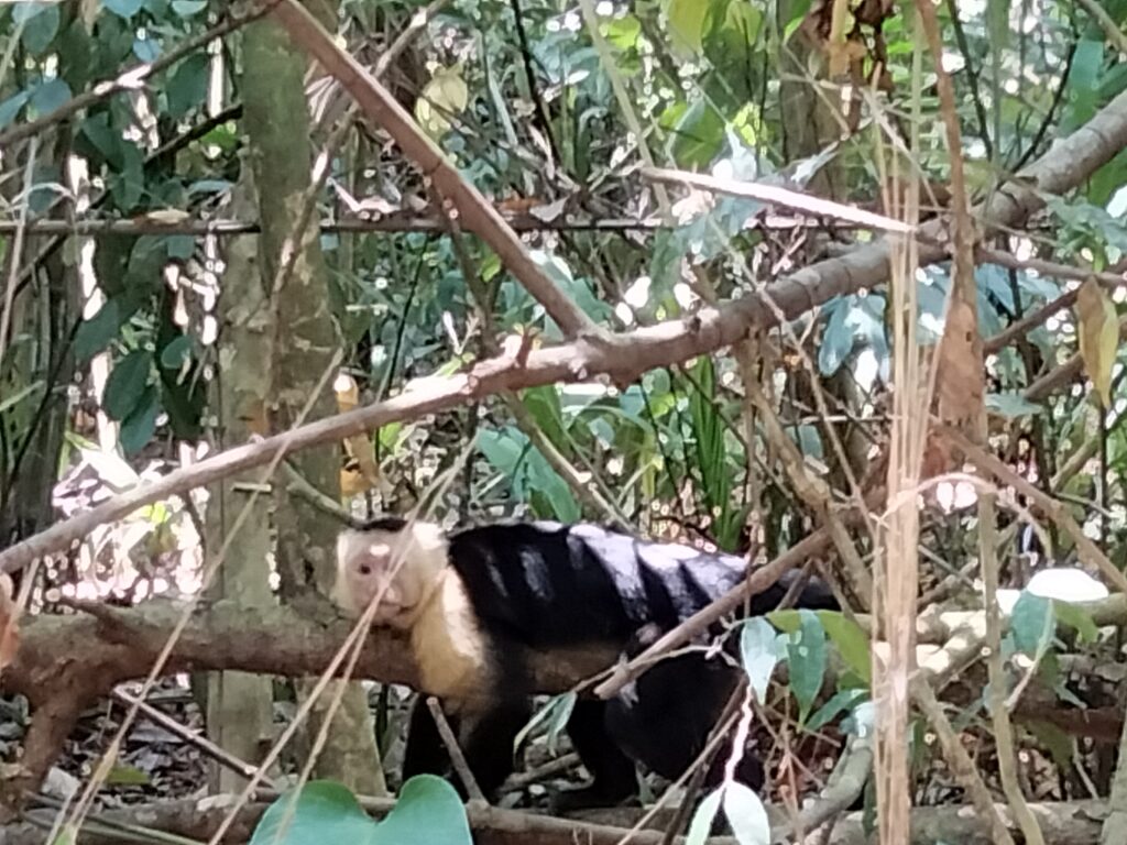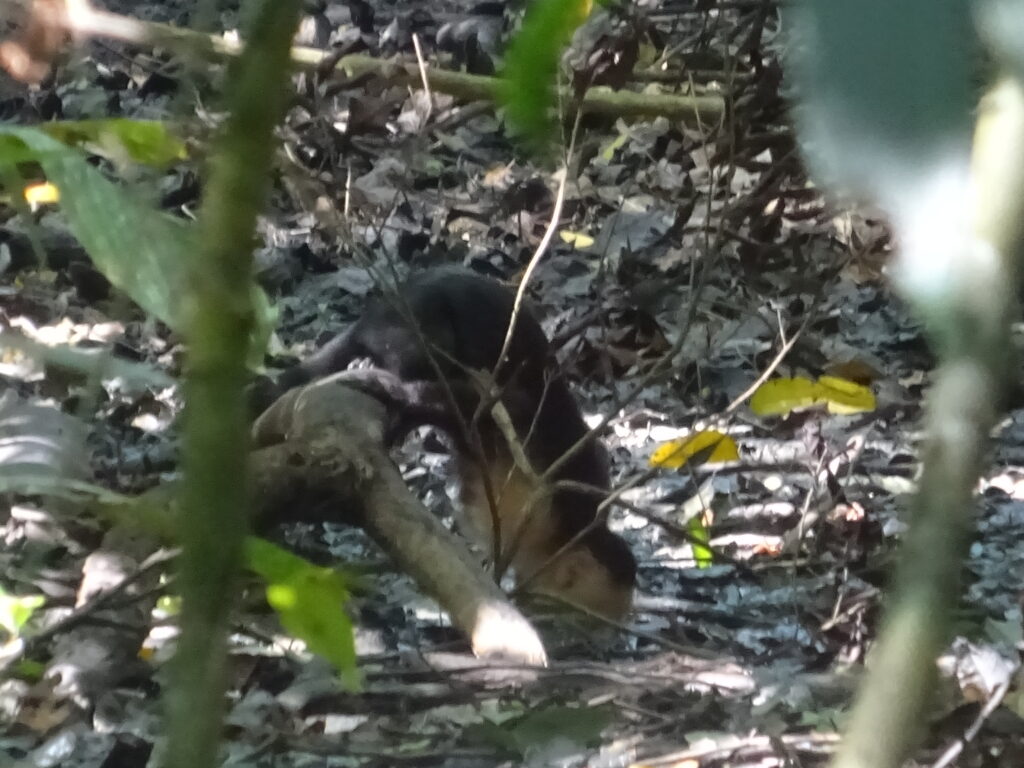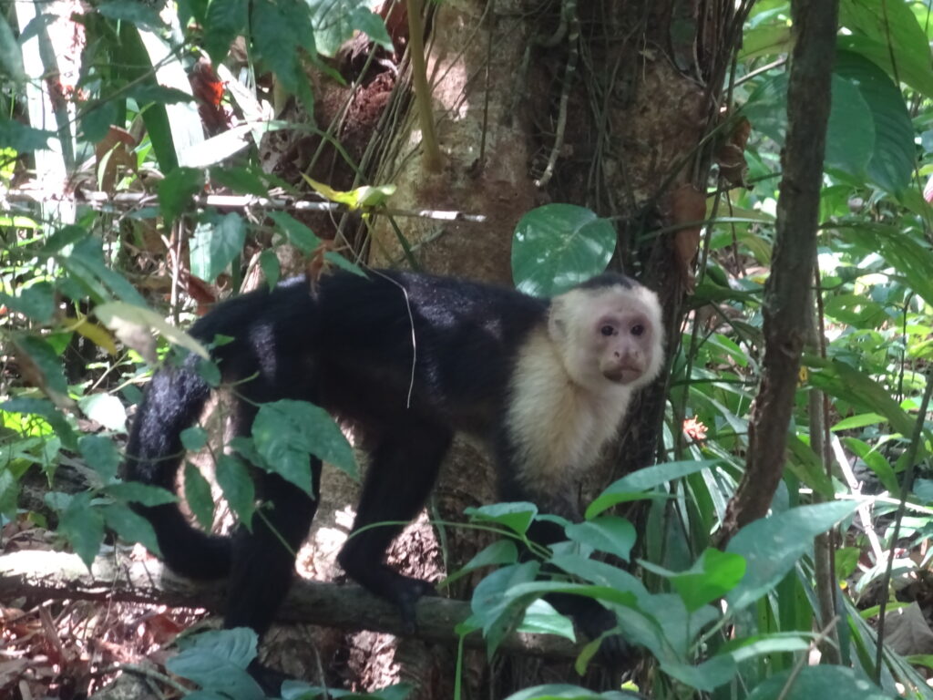 Irgendwann legte Armin aber doch Wert auf unsere Aufmerksamkeit und wir begannen unsere Tour über die ehemaligen Felder und in die Wälder der Hacienda. Armin erklärte vieles: angefangen bei Teakholz über Vogelarten bis zum Kakao. Doch vor allem sahen wir viele Tiere. Diese Sichtungen setzten wir nach einer kurzen Pause (und meinem erneuten Besuch bei Mutter Faultier und Kind) in einem anderen Teil des Geländes fort und trafen dort u.a. auf Kapuzineraffen, Wildschweine und Minikaimane.