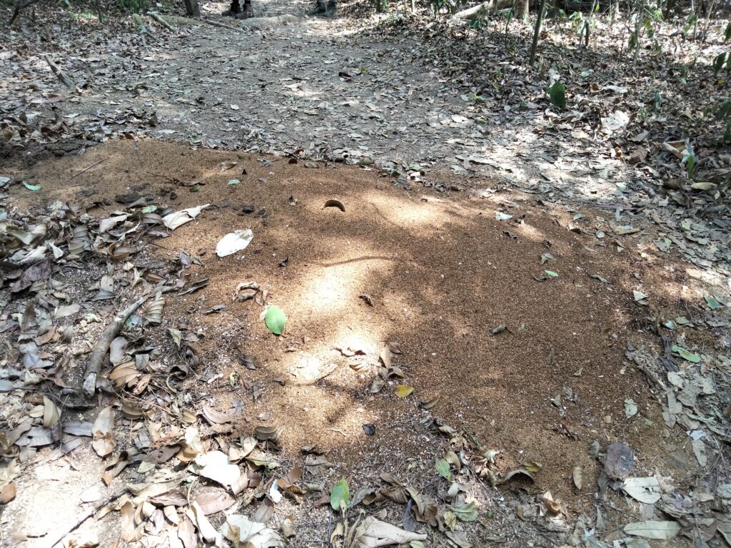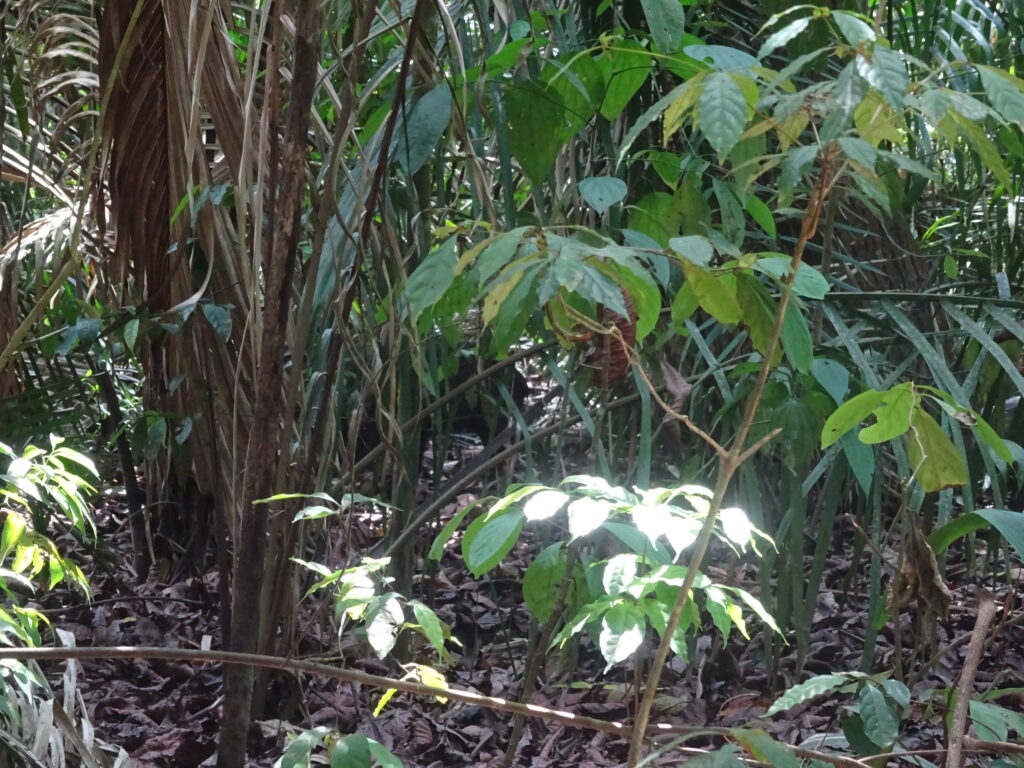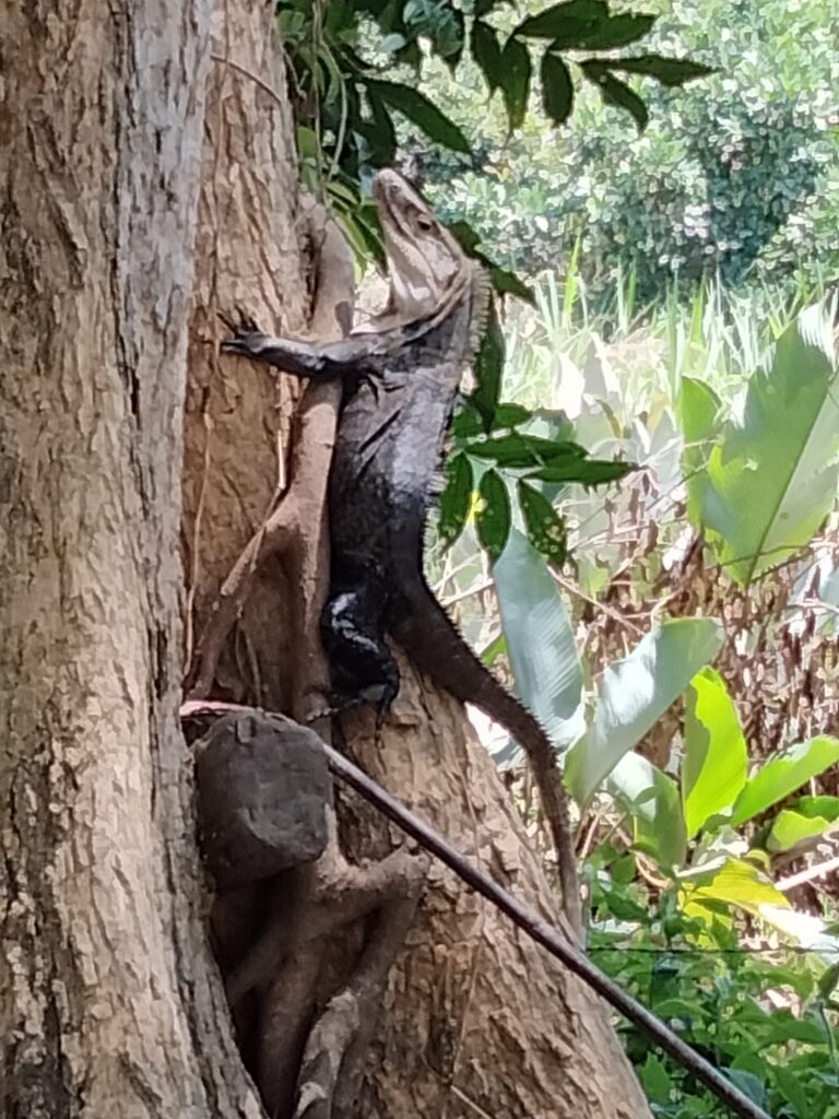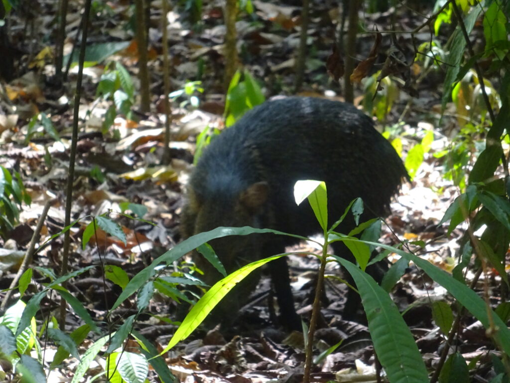 Irgendwann legte Armin aber doch Wert auf unsere Aufmerksamkeit und wir begannen unsere Tour über die ehemaligen Felder und in die Wälder der Hacienda. Armin erklärte vieles: angefangen bei Teakholz über Vogelarten bis zum Kakao. Doch vor allem sahen wir viele Tiere. Diese Sichtungen setzten wir nach einer kurzen Pause (und meinem erneuten Besuch bei Mutter Faultier und Kind) in einem anderen Teil des Geländes fort und trafen dort u.a. auf Kapuzineraffen, Wildschweine und Minikaimane.