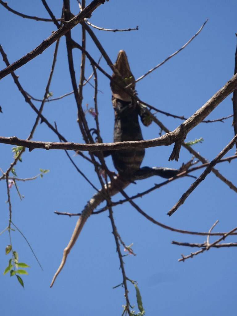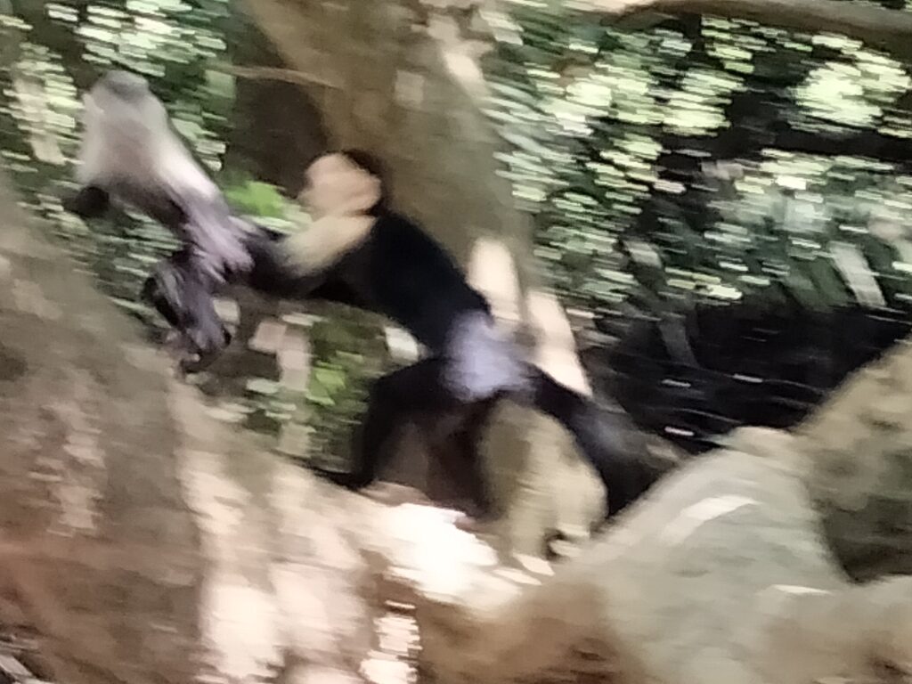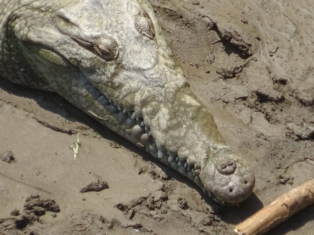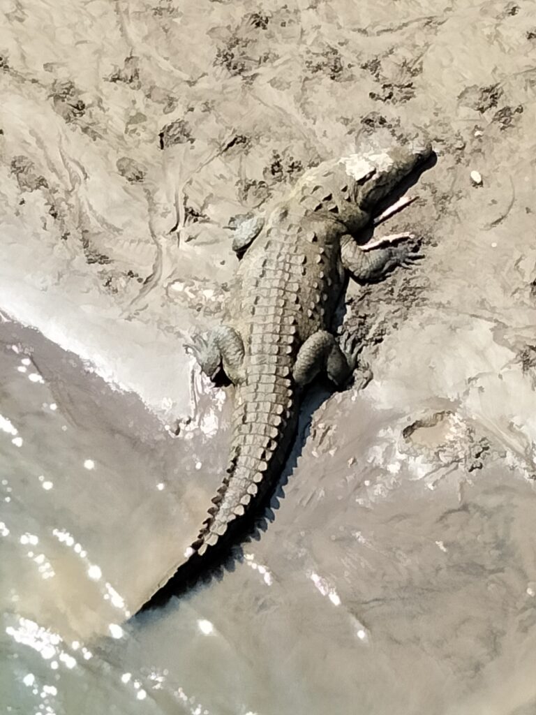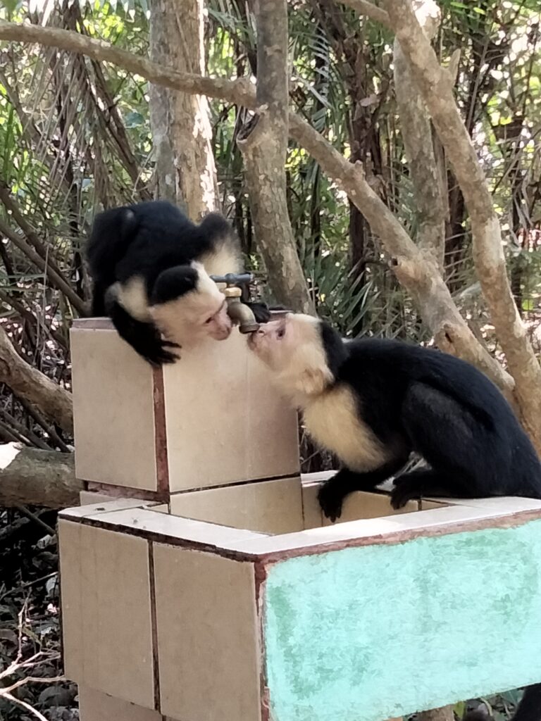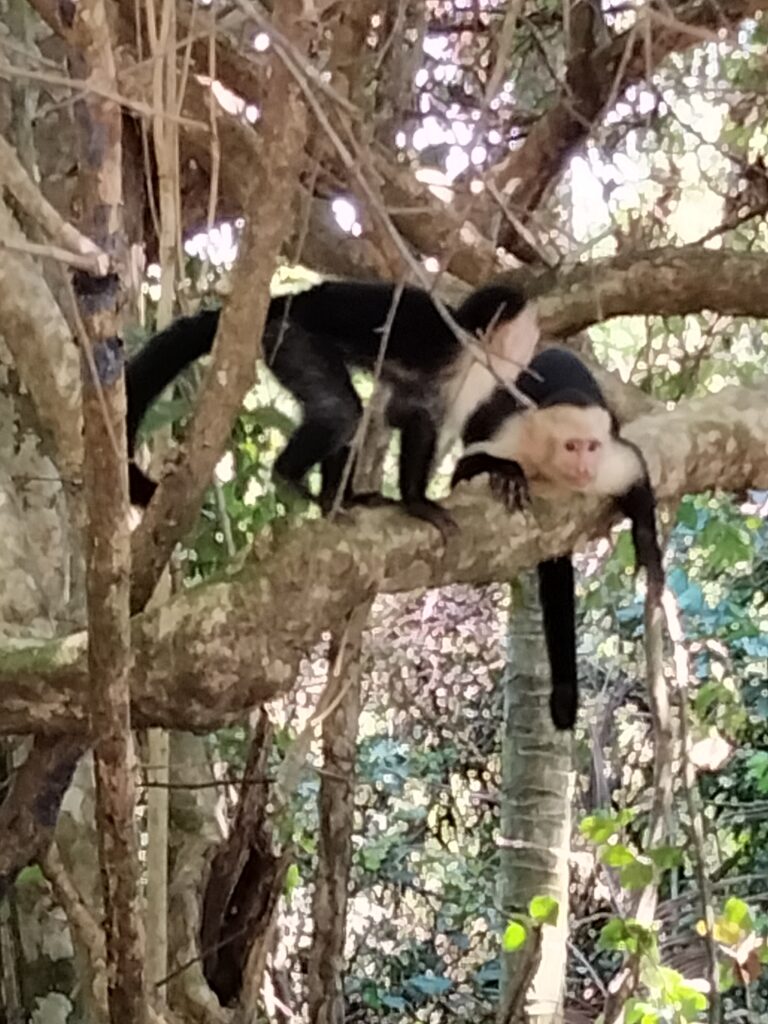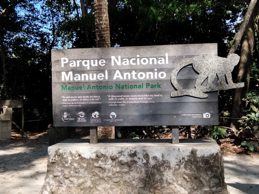 Nach der angesagten Stunde Fahrzeit trafen wir im Nationalpark ein und waren so vielen Menschen ausgesetzt, wie schon lange nicht mehr. Hinzu kamen die lokalen Guides, die sich ihre Kunden schnappten. Taschenkontrolle am Eingang, solange bis es zu viele Touristen auf einmal wurden. Wir waren dort von neun bis elf Uhr und uns schnell einig, dass wir alle auf diesen Stop hätten verzichten können. Der Weg bestand aus einer breiten Schotterstraße, auf der man ständig andere Touristen oder gar Gruppen überholen musste. Einmal auf und einmal hinab zum Strand, wo viele blieben. Dann zurück auf einem erdigen Pfad und einer Brücke über Magroven hinweg. Tiere? Einige spielende Kapuzineräffchen, ein Aguti, ein Faultier, einige Leguane. Aber an allen sind wir zügig vorbeigegangen, denn wir hatten es ja auch eilig. Dieser Part stresste nur und brachte nichts – darin herrschte Einigkeit.