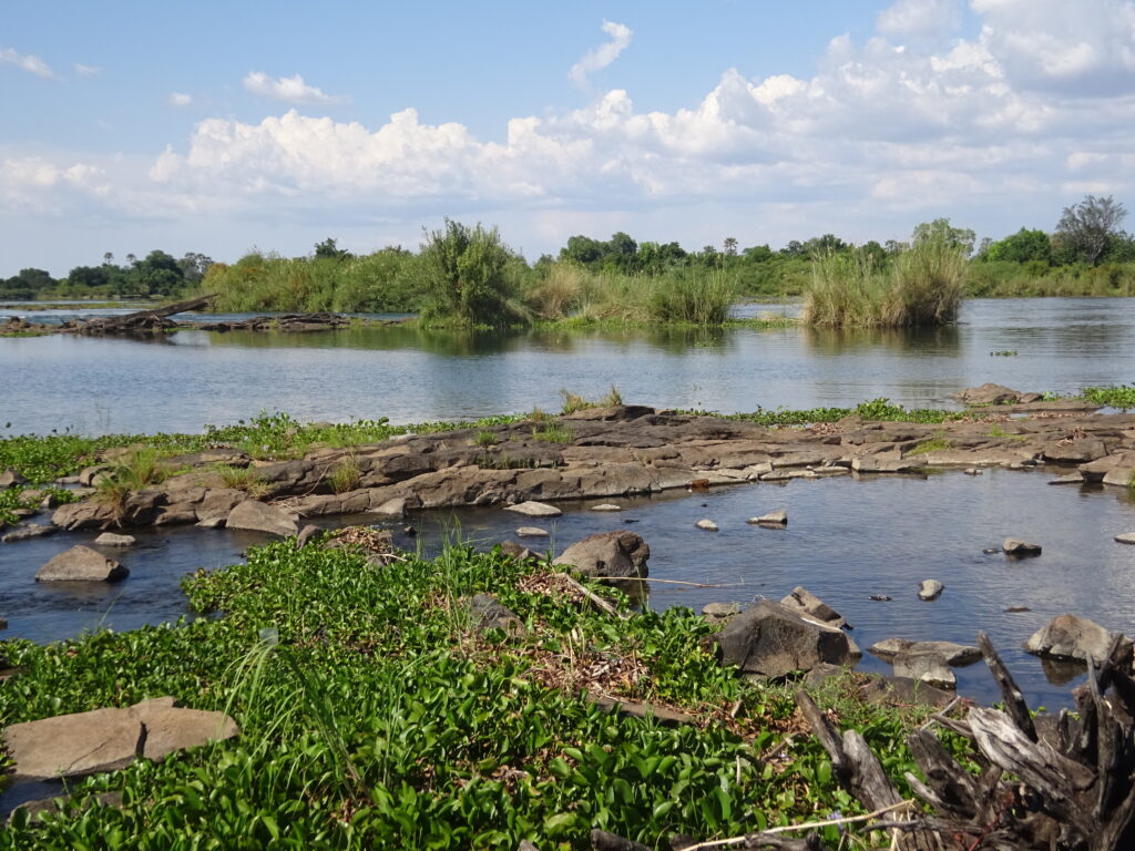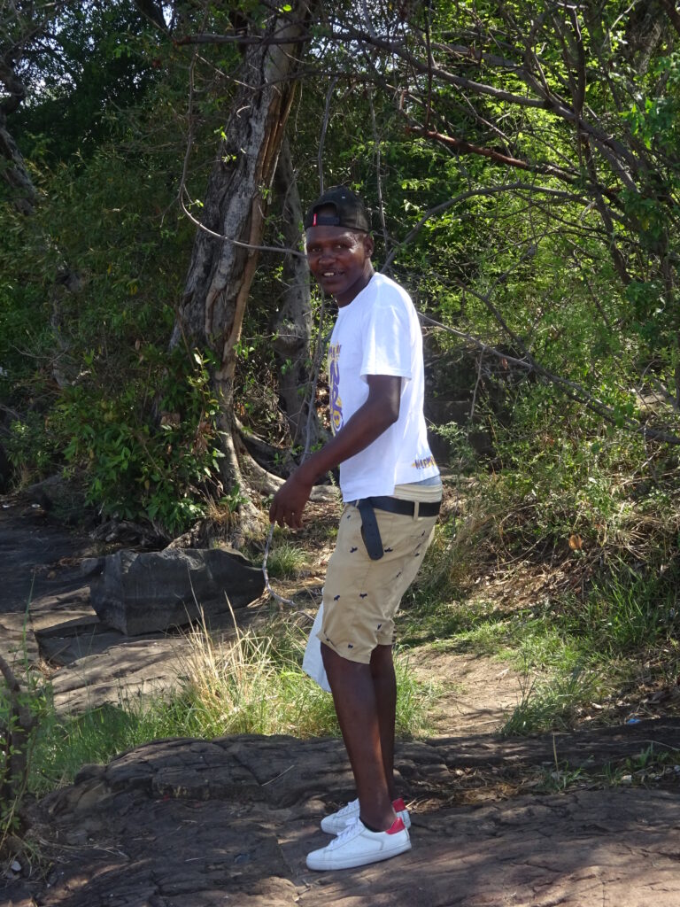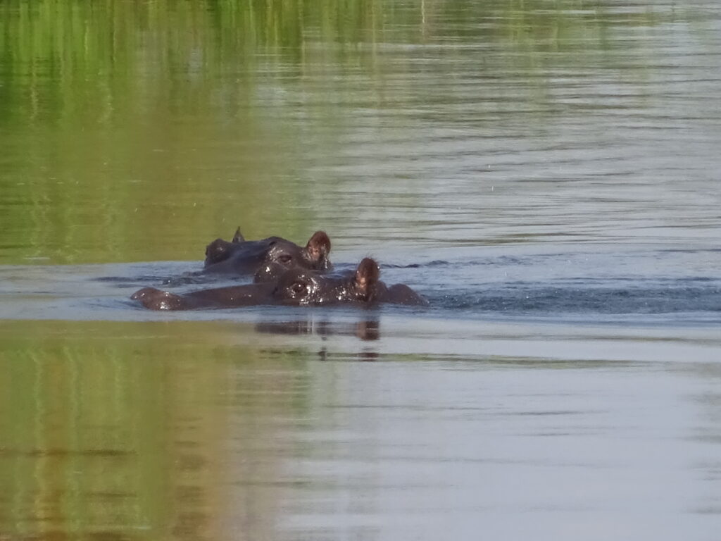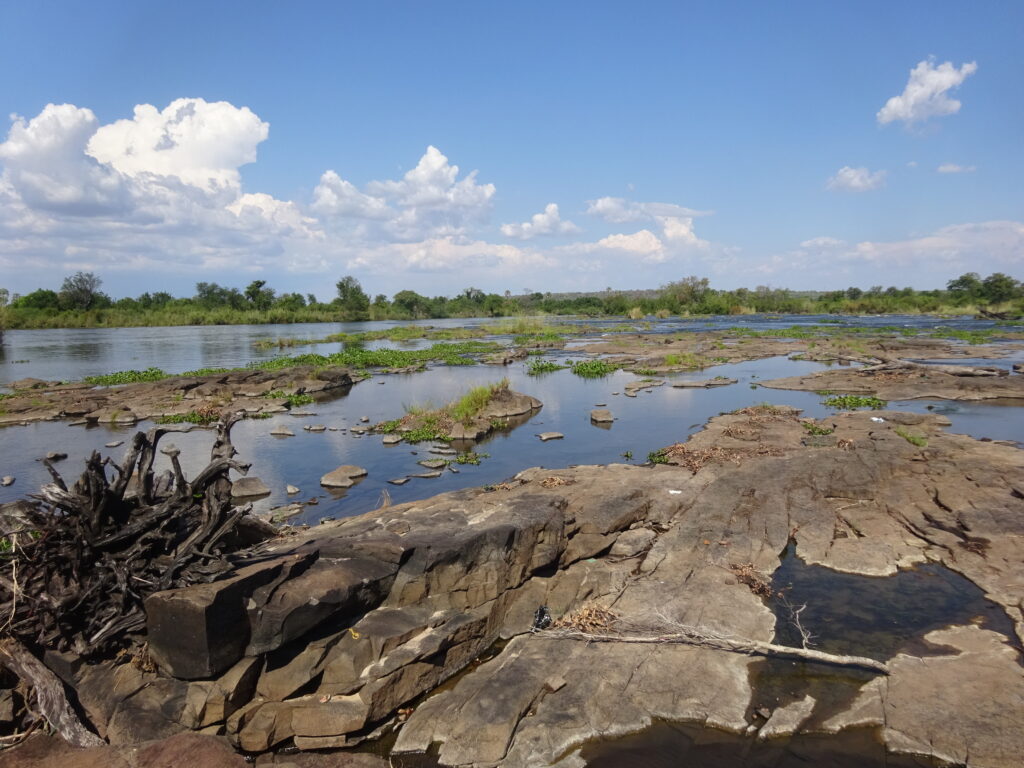 Der Guide Tanaka und der Fahrer Lawrence erwarteten uns vorbildlich mit Schild und sammelten nahezu alle Weißen (ab einem gewissen Alter) ein. Dann wurden wir in einen Minibus (17 Plätze) mit Anhänger für das Gepäck verfrachtet und zum Check-In im Hotel befördert. Vor dem Losfahren gab es noch ein paar kurze Fragen und Antworten für den heutigen und den morgigen Tag, was zeigte, dass sich hier noch einiges einspielen muss. Wahrscheinlich sind auch die Erfahrungswerte der Teilnehmer hinsichtlich derartiger Reisen recht unterschiedlich. Mal schauen, wie es werden wird… Nachdem ich meine Sachen im Zimmer abgestellt und kurze Klamotten angezogen hatte (um die 30 Grad im Schatten), ging ich los auf einen Spaziergang. Dieser sollte eigentlich nur zum Supermarkt führen, um Wasser aufzufüllen. Doch dann dachte ich mir, ich könnte mir ja mal Victoria Falls ansehen. Beim Schlendern wurde ich schnell von männlichen Verkäufern angequatscht, aber sie konnte ich freundlich zurückweisen. Und dann war auch gut. Einmal kam mir ein freundlicher Straßenverkäufer unter, der mir anbot, mir den Sambesi und die kostenfrei zugängliche Region um die Victoriafälle zu zeigen. Er schien ganz ok zu sein, weswegen ich mit ihm ging. Es hat sich auch wirklich gelohnt. Wir unterhielten uns beide radebrechend auf Englisch. Dabei erzählte er (nickname: Jojo) etwas von seiner Lebenssituation und stellte mir neugierige Fragen (das Übliche: woher? Status? Beruf? Etc.). Er erklärte, soweit wir einander verstanden, und führte mich in einem großen Bogen herum. Dabei kamen wir zum Sambesi, der zurzeit recht trocken ist (s. die vielen freiliegenden Steinblöcke im Flußbett). Dort gibt es auch Krokodile, die wir leider nicht antrafen. Dafür habe ich aber meine ersten authentischen Nilpferde (Hippos) gesehen, die gerade gemütlich badeten. Zwischendurch kam am Ufer auch eine Gruppe mit männlichen, jungen Chinesen vorbei, bei denen Jojo gleich seine Sachen (Salatschüsseln aus Holz, Simbabwe-Währung) zu verkaufen versuchte. Leider ohne Erfolg. Sie hatten aber auch kein Interesse an den Tieren, nur rauchen und ein paar Fotos… Als sie weg waren, zogen wir auch weiter: zum größten Baobab-Baum der Gegend. Dort gab es gleich etliche Händler, die mir etwas verkaufen wollten, allerdings wollte ich nichts kaufen. Interessant war es trotzdem, weil ich mich bei dem einen – angeblich Jojos Bruder – über Material und Preis in Relation zur Arbeitszeit informieren konnte. Danach war mir endgültig klar, dass und wieviel ich Jojo für seine Zeit mit mir geben würde (15 $). Er hatte in unseren 2,5 h nichts verkaufen können und mir war er eine Hilfe. Arbeitszeit muss entlohnt werden – das habe ich gerade neulich zu meinem eigenen Vorteil gelernt.