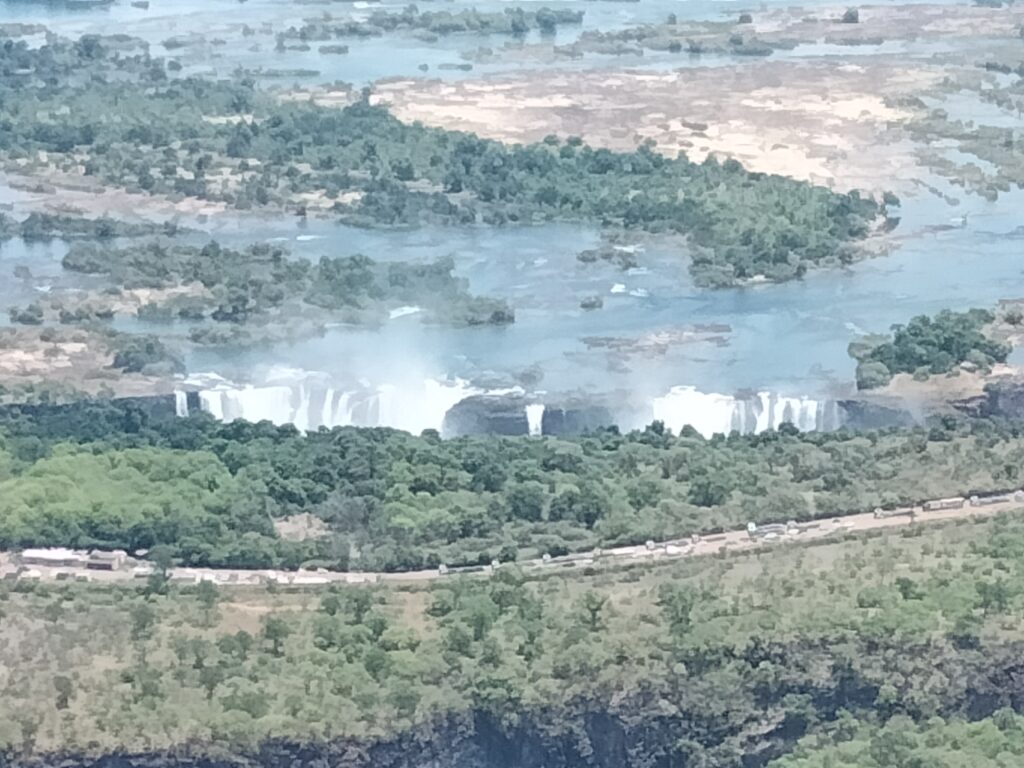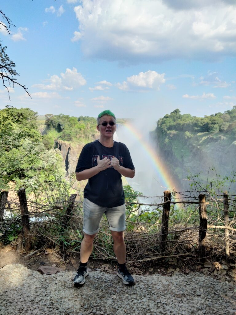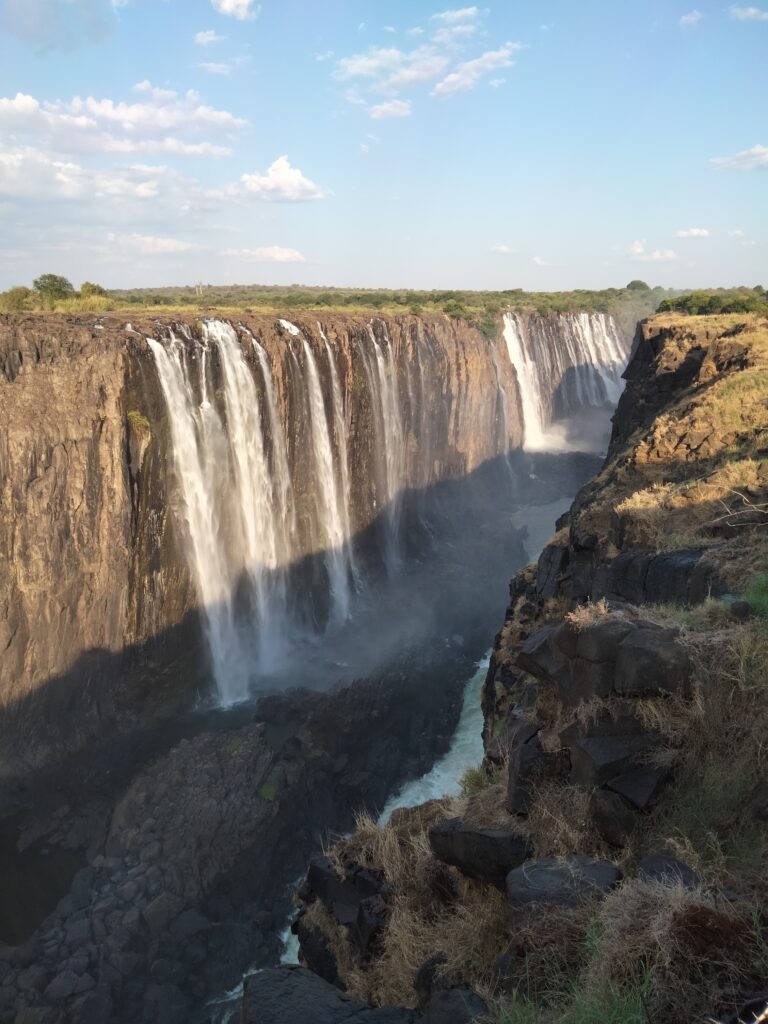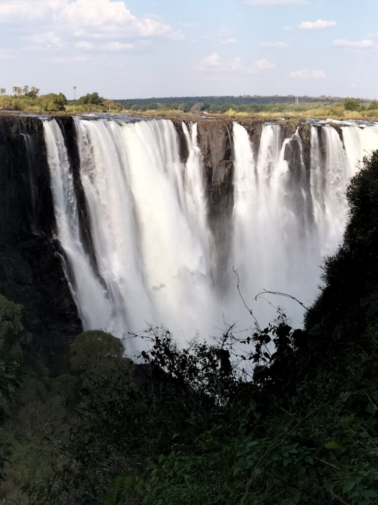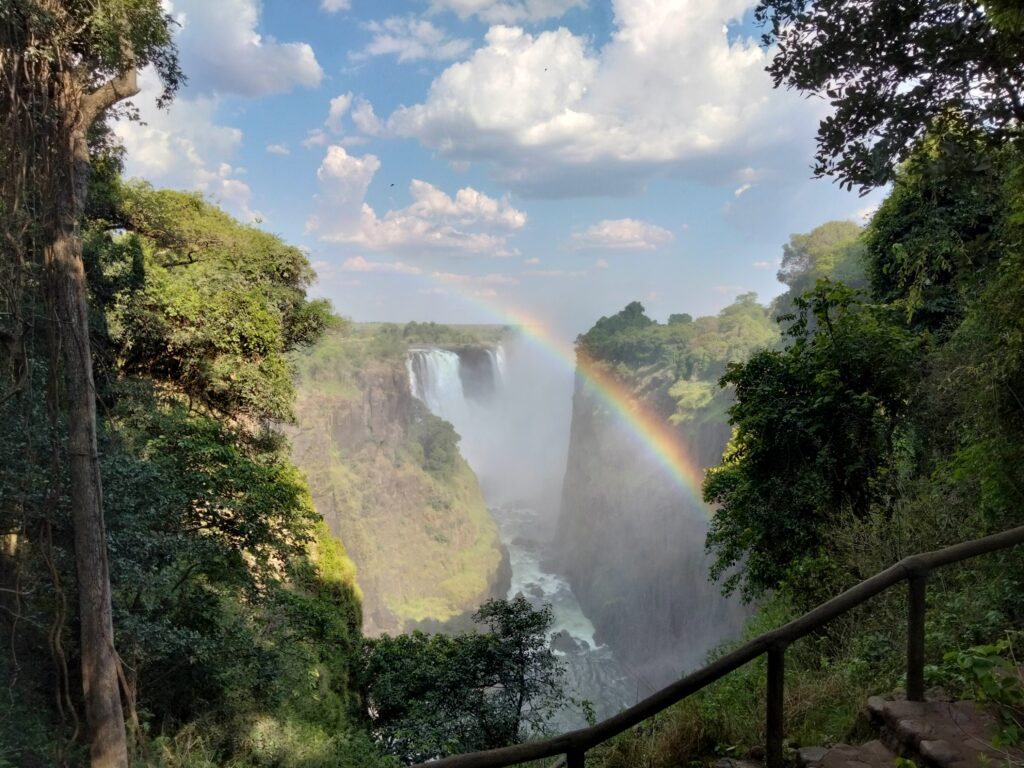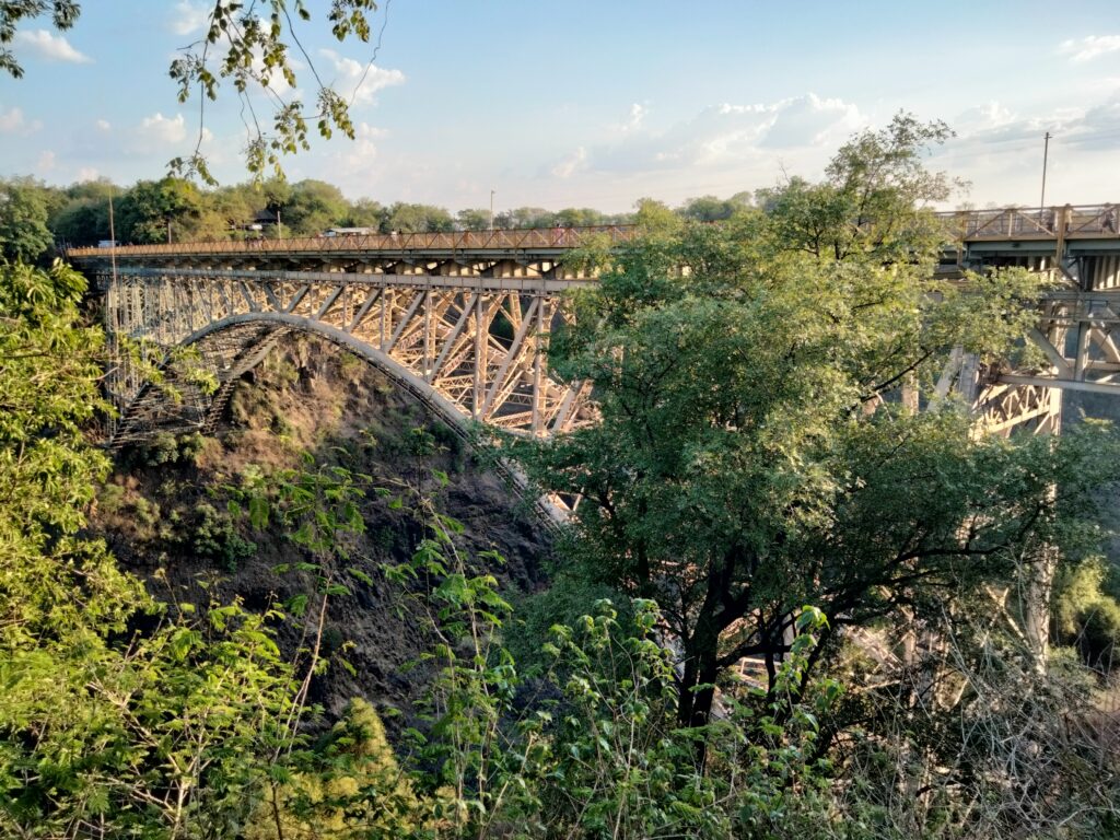 Nach unserer Rückkehr in die Lodge (Hotel) zog ich mich zum Ausruhen auf das Zimmer zurück. Es ging um 15.30 Uhr weiter zu den Victoriafällen (in der Sprache der Einheimischen: Nebel des Donners) im Bezahlbereich. Ein lokaler Guide erklärte die Route an den Fällen entlang und erzählte auch so noch einiges über den Hintergrund der Fälle. Wir schlichen anschließend von Aussichtspunkt zu Aussichtspunkt, doch das war ok, weil es selbst mit Niedrigwasser im Sambesi wirklich beeindruckende Fälle sind. Oder vielmehr die Schlucht, in die das Wasser hineinplatscht. Naje, eher rauscht. Bei unserer Wanderung sahen wir unglaublich viele Regenbogen und wurden auch kurz aus dem Himmel geduscht. Zuletzt blickten wir auf die Victoria Bridge, die den Canyon überbrückt und Simbabwe und Sambia (ehemals beides Rhodesien) miteinander verbindet. Sie wurde 1904 fertiggestellt und kann noch heute von Zügen und LKWs befahren werden. Das war mal echte Baukunst. Von dort marschierten wir zurück zum Ausgang und kehrten zur Aufbereitung für das Abendessen ins Hotel zurück.