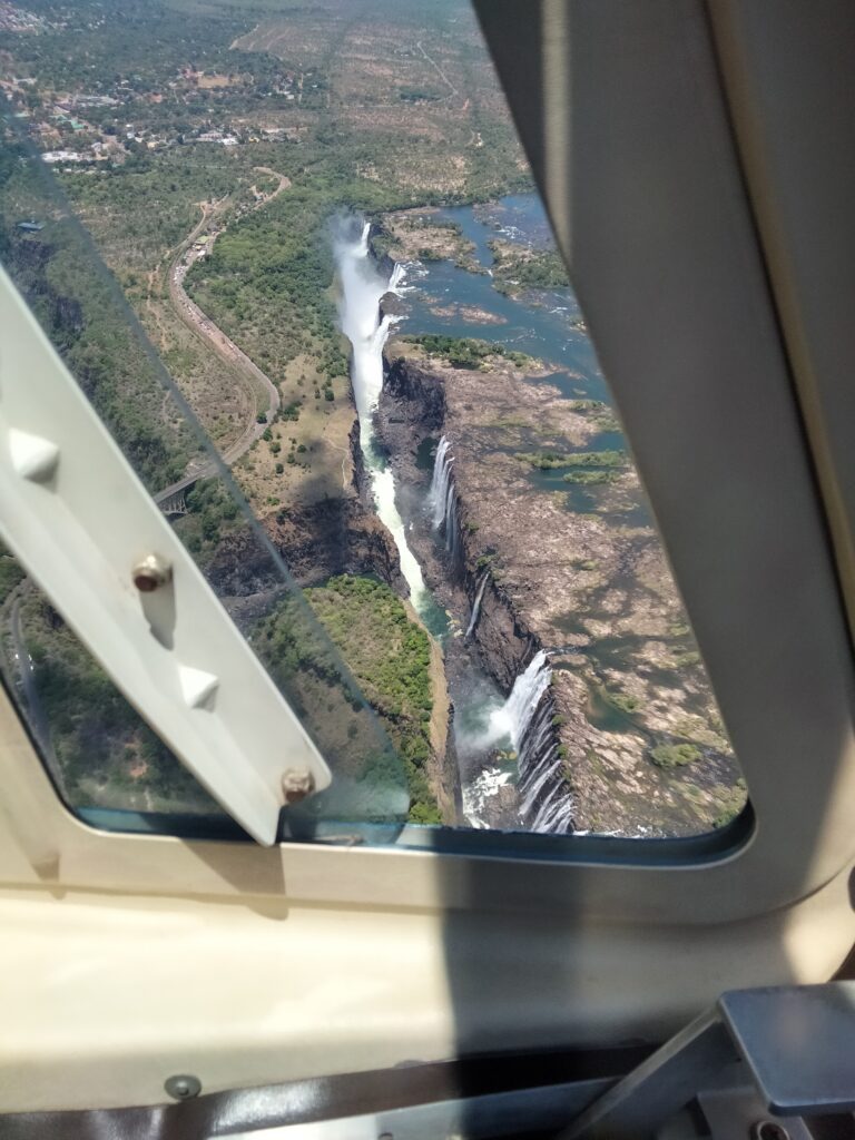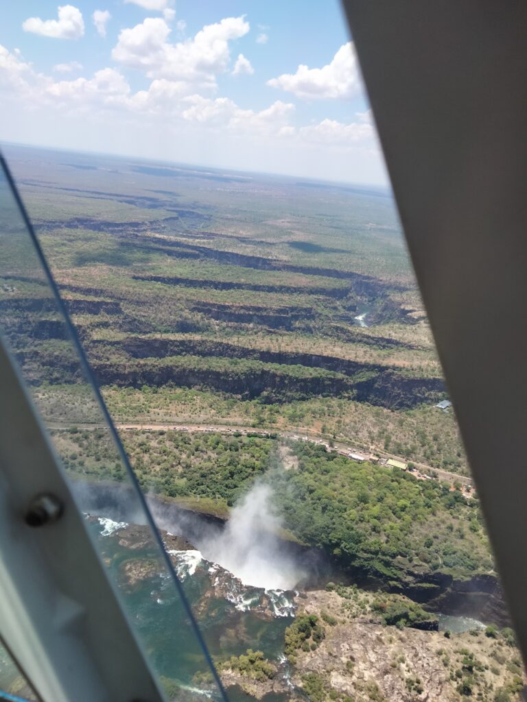 Ein gemütlicher Start in den Tag mit einem späten Frühstück kurz nach 9 Uhr brachte mich langsam in Gang. Das Buffet war nahezu geleert, doch für meine Bedürfnisse gab es noch genug (eigentlich zu viel). Ein wenig Hin und Her folgte, dann wurden wir (10 Leute) mit zwei Taxis abgeholt und zum Tourenanbieter für unseren Helikopterflug gebracht. Meine Gruppe war die erste, die vorbereitet wurde. Wiegen, Formular ausfüllen, Bezahlen, Sicherheitseinweisung für alle und bald darauf ging es los zu unserem 15min Flug. Der Pilot Walter war echt gut und sanft in der Steuerung. Un dich hatte den besten Platz ever ergattert: Vorn neben dem Piloten mit freiem Blick nach unten und Fußpedalen direkt im Cockpit. SUPER! Der Flug und die Sicht waren einfach toll, auch wenn ich zugeben muss, dass mein Körper beim leichten in die Kurve gehen und mit Blick nach unten doch etwas mulmig reagierte. Die Schlucht, die Wasserfälle und die Umgebung von oben zu sehen hat sich richtig gelohnt. Auf dem Rückweg gab es dann noch Elefanten und Büffel zu sehen, die sich unter Bäumen im Schatten zusammengerottet hatten. Allerdings brauchte ich deutlich zu lang, um „the green trees with shadows“ zu sehen. Es gab nämlich viele Bäume, die Schatten spendeten. Also sah ich die Tiere nur sehr kurz und für Fotos hat es nur bei anderen aus der Gruppe gereicht. Vielleicht bettele ich sie mal um diese an…