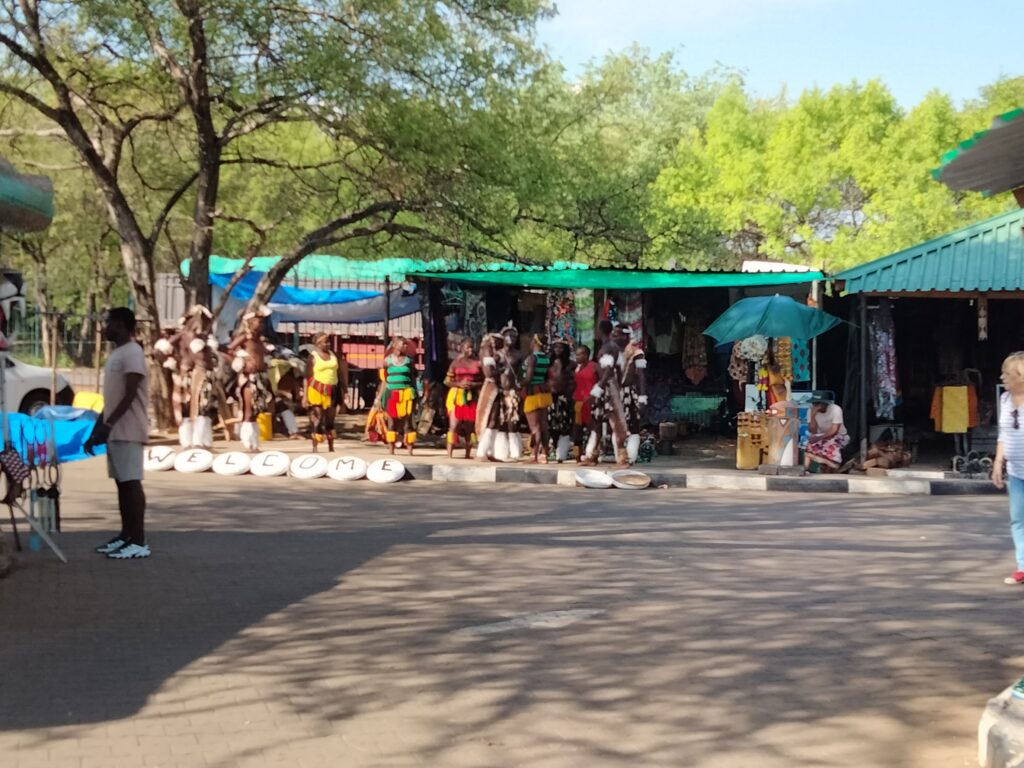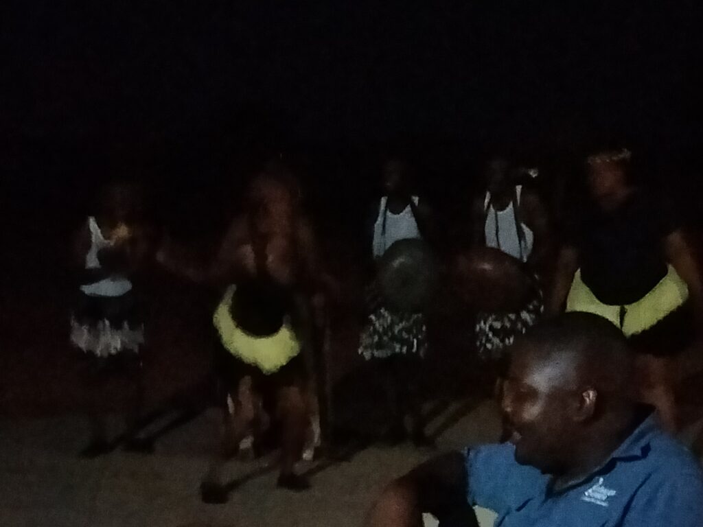 Das Abendessen fand unter freiem Himmel statt. Leider wurden wir erheblich von Käfern o.ä. belästigt, die alle zum Licht wollten. Die Öllampen wurde daraufhin weiter entfernt aufgestellt, aber etwas Licht brauchten wir ja auch, um das Essen sehen zu können. Ich schütze mich vor zu viel Gekrabbel mit meinem Pullover, obwohl das ziemlich warm war. Andere hatten da mehr Kontakt. Während der Essensvorbereitung spielte eine einheimische Gruppe auf, tanzte und sang zur eigenen Musik. Die Lautstärke verhinderte Gespräche immer wieder und wegen dieser Krabbelplage waren einige auch deutlich angespannt, was dem Loslassen, das der Leadsänger anmahnte, eher abträglich war. Doch die Leute waren so freundlich und zuvorkommend, wie man es sich nur wünschen konnte. Nach der Vorspeise (Tomatensuppe mit Brot) referierte Tanaka über den ersten Teil der Reise, die wir ab morgen in Angriff nehmen. Nach dem Hauptgang – Steak für die anderen, nur Kartoffeln und Veggies für mich – setzte er diesen Bericht fort, bis er damit endete, dass wir uns morgen um 8.30 Uhr auf den Weg nach Botswana machen werden. Es folgte die Nachspeise, die letzten Rhythmen, zu denen zwei von uns sogar kurz etwas tanzten, und Dunkelheit mit einem Blick in den Himmel, der von einem der Organisatoren des Abends mit Laserpointer und Erklärungen begleitet wurde. Schließlich blieb nur noch das Bezahlen übrig, das auf meinen Hinweis hin, man könne die Challenge mit der Internetverbindung mal aufnehmen, sogar mit der Karte erledigt werden konnte. Sie haben übrigens meinen Menüpreis etwas gesenkt, da ich ja kein Fleisch konsumiert habe. Von dort ging es zurück ins Hotel, Sachen etwas umpacken, da wir mogen beide Schuhpaare in einer Schlammpfütze werden baden müssen (Einreisebedingung nach Botswana, Schutz vor Maul-und Klauenseuche). Jetzt noch der Blog und die Fotos, Upload morgen beim Frühstück.