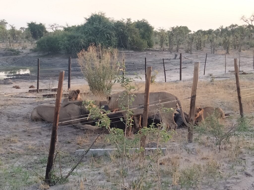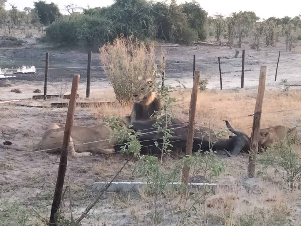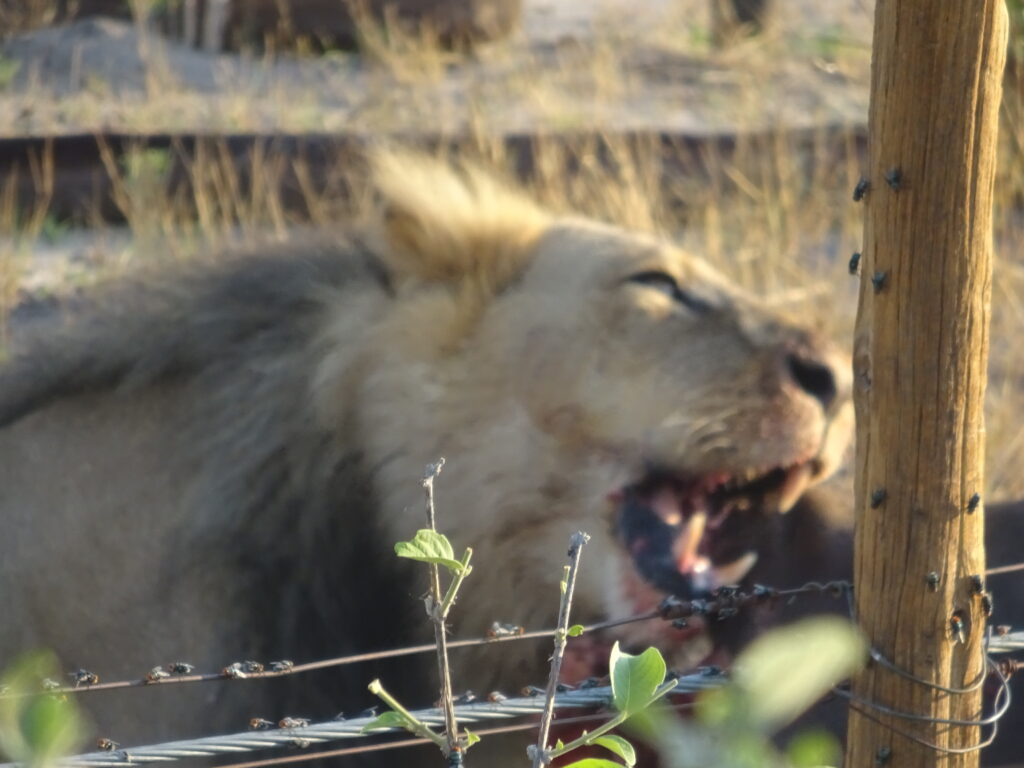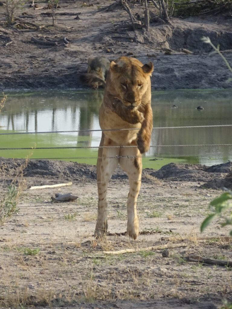 Wir waren kaum losgefahren, da trafen wir auf eine Gruppe von etwa 8 Löwen, die gerade ihr soeben erbeutetes Frühstück (einen Büffel) verzehrten. Hier verweilten wir lange, fotographierten und filmten. Die Hierarchie der Gruppe wurde schnell deutlich: Der älteste fraß am besten Stück (Hinterteil), die anderen suchten sich je nach Rang einen Platz rund um den Kadaver. In der Ferne warteten die Geier bereits geduldig auf ihren Anteil, während die Löwen immer weiter fraßen und zwischendurch am nahegelegenen, sehr trüben Wasserloch ihren Durst stillten. Da sie ihr Opfer genau im „Todesstreifen“, d.h. zwischen den beiden das Land durchteilende Zäunen zum Schutz vor der Maul- und Klauenseuche, erlegt hatten, mussten sie zum Saufen einen Zaun überwinden. Dies erreichten sie durch drunter hindurch schlüpfen (kleiner / schlanker Löwe), durch zwischen den Drähten durchsteigen oder durch Überspringen. Alles sehr sehenswert! Auch das gelegentliche Knurren, Fauchen oder später das Brüllen des Anführers beim Wegschreiten waren beeindruckend. Wer ist schon so nah an einer Löwenbande, die sich an ihrem Mahl erfreut?