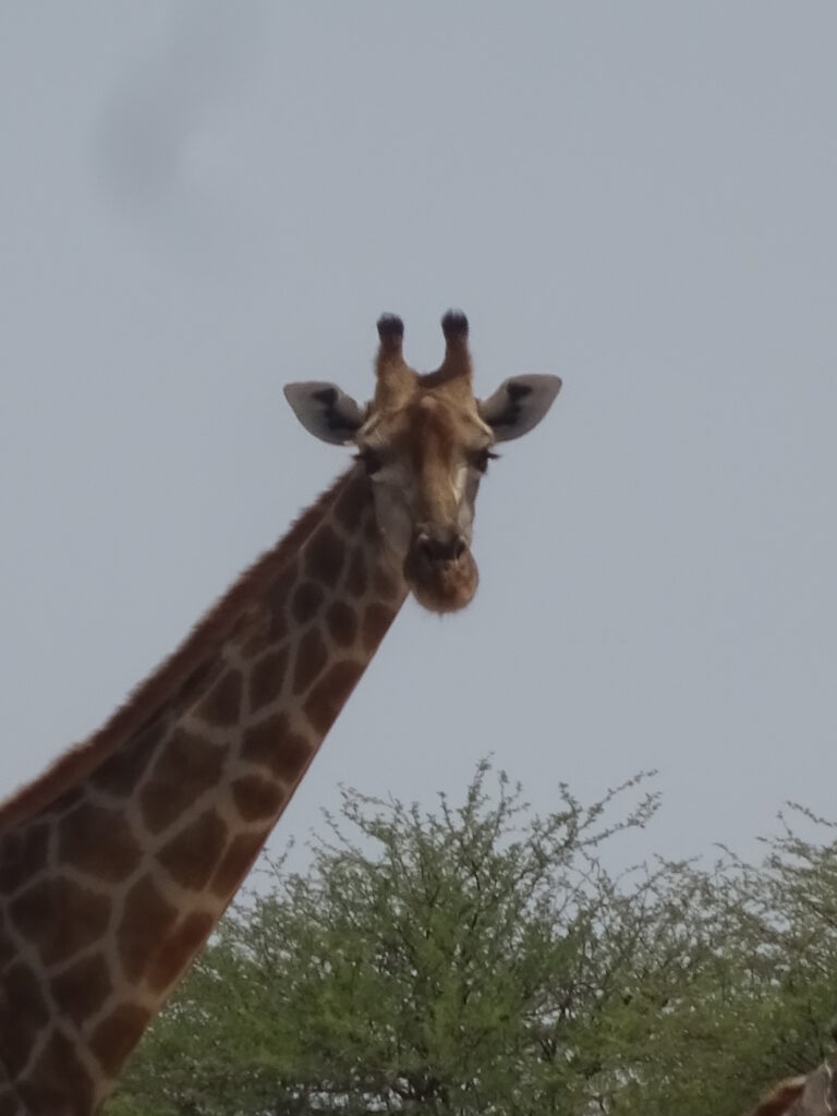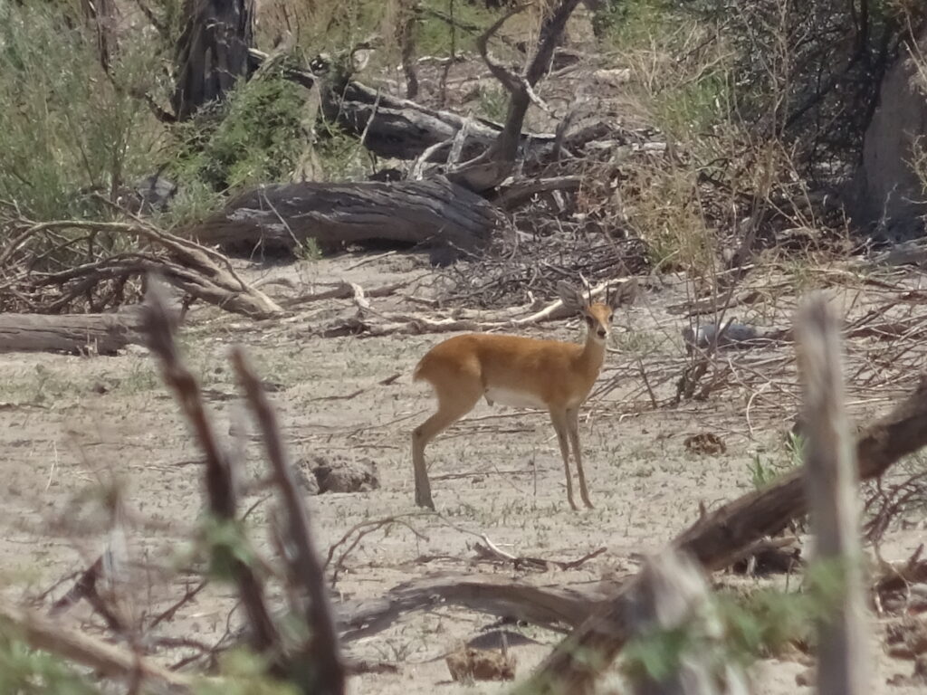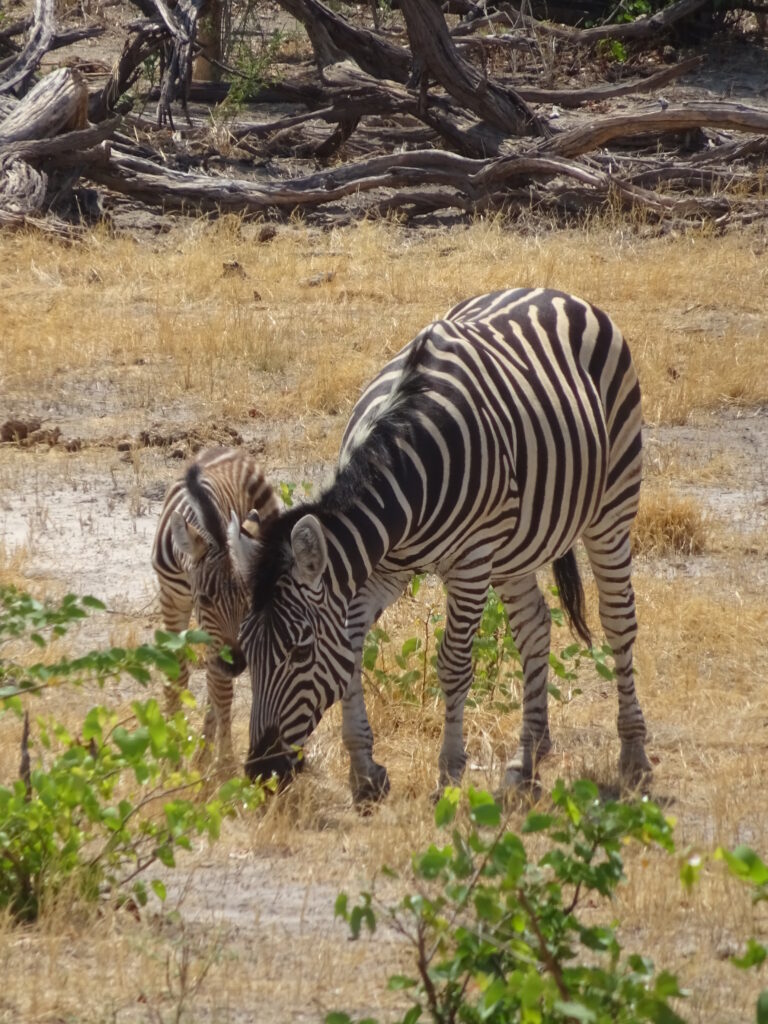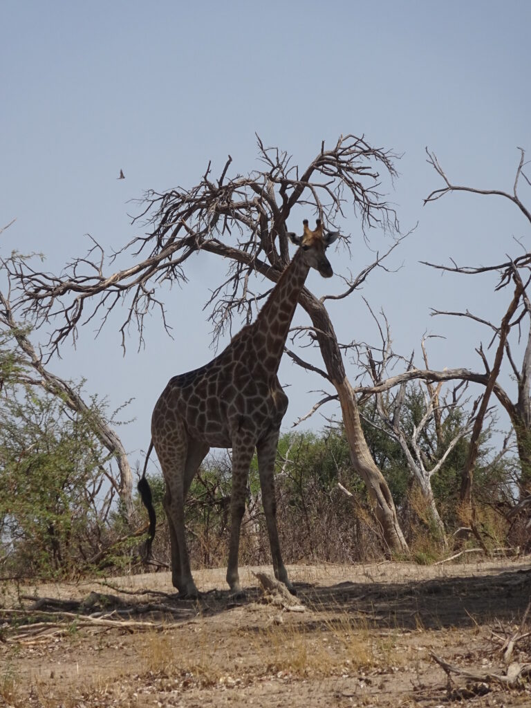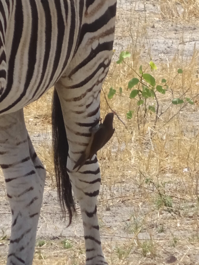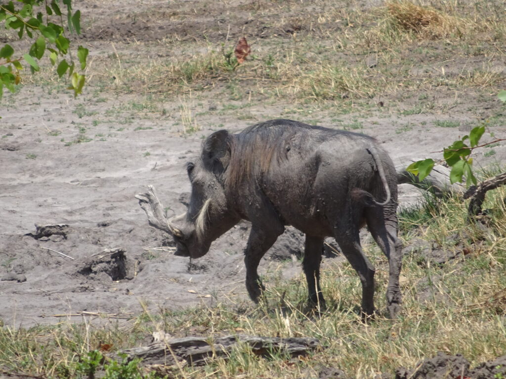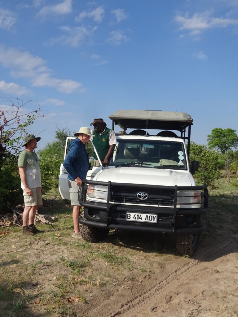 Nach langer Zeit der Beobachtung fuhren wir weiter und sahen Elefanten, die groß wie Häuser sich durch das Unterholz schoben. Außerdem trafen wir auf Büffel, die eng gedrängt ihren Nachwuchs beschützten. Vögel gibt es ebenfalls viele zu sehen. Desweiteren erblickten wir einen Mungo und viele Impalas. Zwischendurch hielten wir einmal an, um „Bushy-Bushy“ zu erledigen – links die Männer, rechts die Frauen. Irgendwann erreichten wir einen „Rastplatz“, an dem unsere Guides das Frühstück auspackten und wir futterten. Ich stellte mich in die Sonne, um mich zu wärmen und auch um nicht wieder zu sitzen. Danach brachen wir in ein angrenzendes Schutzgebiet auf. In der folgenden Zeit erblickten wir Giraffen, Warzenschweine, viele Vögel, Elefanten, Zebras und auf dem Rückweg von dieser Tour auch einen Strauß. Von den Big Five fehlen mir nun noch Leopard, den gestern einige kurz gesehen haben (anderer Jeep), und das Nashorn, was ich eher nicht zu sehen bekommen werde, weil dies nicht frei in Botswana vorkommt.