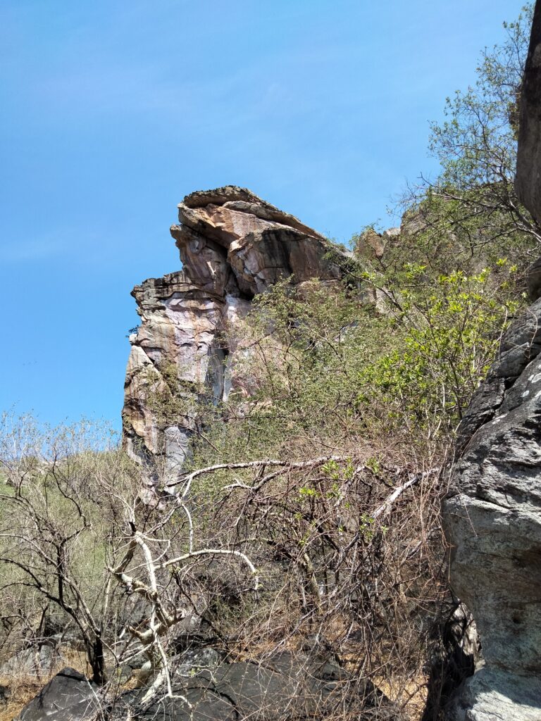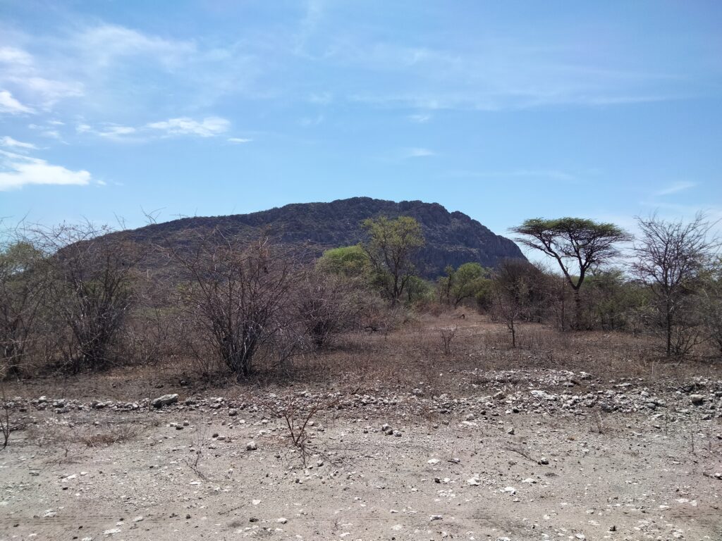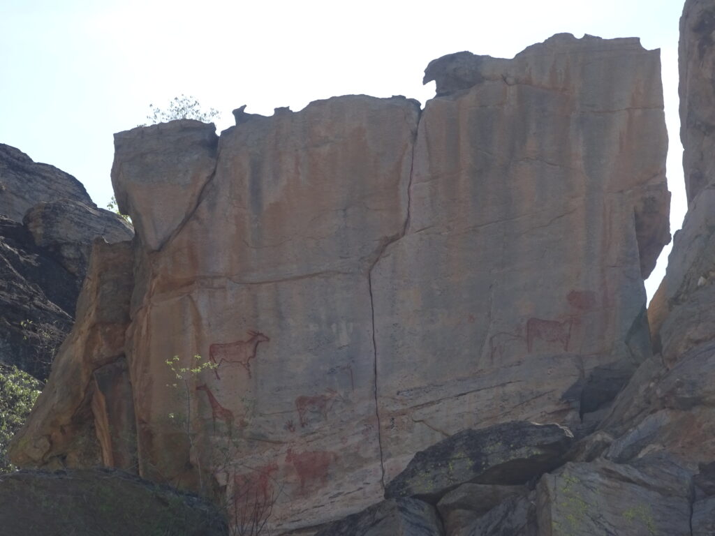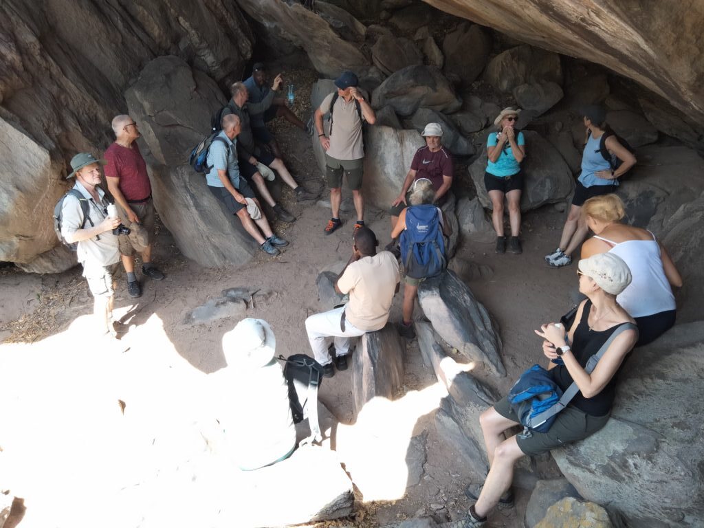 Nach fast einer Stunde auf dieser Strecke erreichten wir den Eingang zu den Felsmalereien der San (Nomadenstamm) am Tsodillo Mountain. Wir fuhren auf dem Gelände etwas näher bis zum Museum und den Pfaden, stiegen aus und trafen auf den Local Guide (kein San). Sand, Staub und Sonne erschwerten vielen das Gehen auf dem Rhino-Pfad, wo wir einige Wandmalereien gezeigt bekamen. Ich gebe zu, ich wäre lieber um den einen Hügel herumgelaufen, als mir kryptische Wandzeichnungen anzusehen. Die gesamte Tour dauerte nur 1,5 h (2 km – dank der vielen anwesenden Smartwatches erfasst) und war für mich wirklich nicht so ergiebig, außer dass ich im Anschluss allein schon zu Fuß zum Eingang des Geländes vorauseilte. Jeder Kilometer nicht in dem Bus und mal in Eigenregie und mit Bewegung waren willkommen. Ich hörte nur das Zirpen (Kreischen) der Zikaden oder ähnlicher Flattertiere und trabte in der prallen Sonne eiligst davon. Die anderen holten mich erst auf der Zielgerade vor dem Eingang wieder ein.