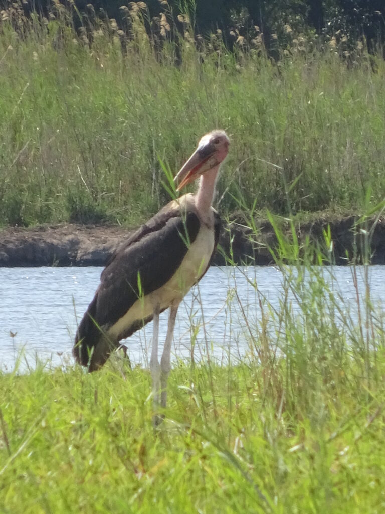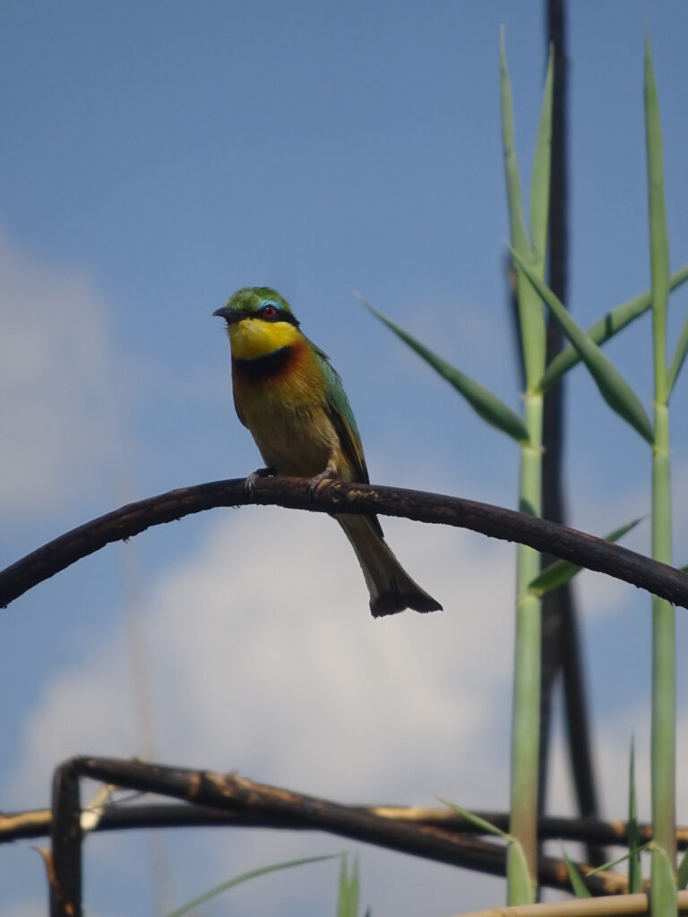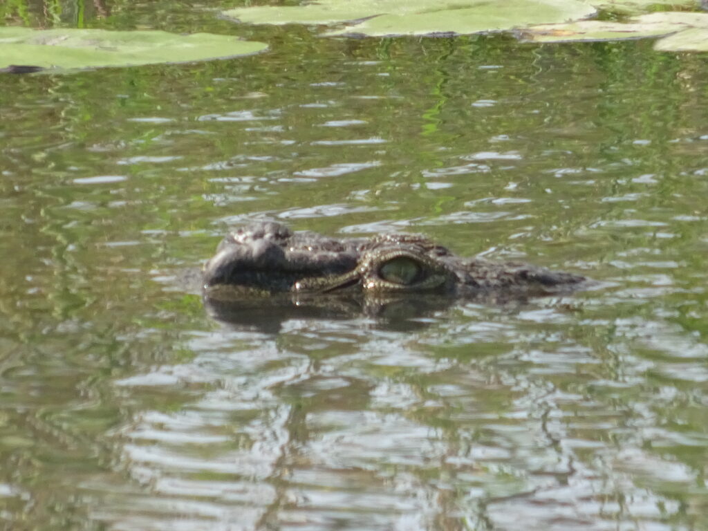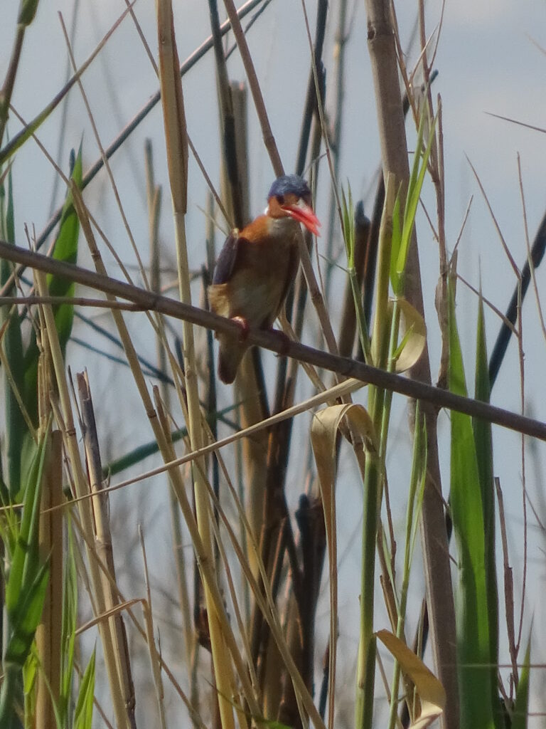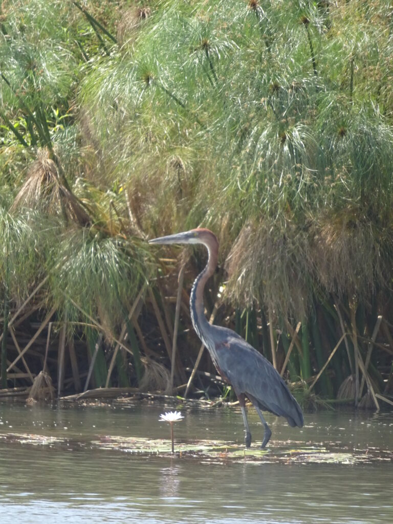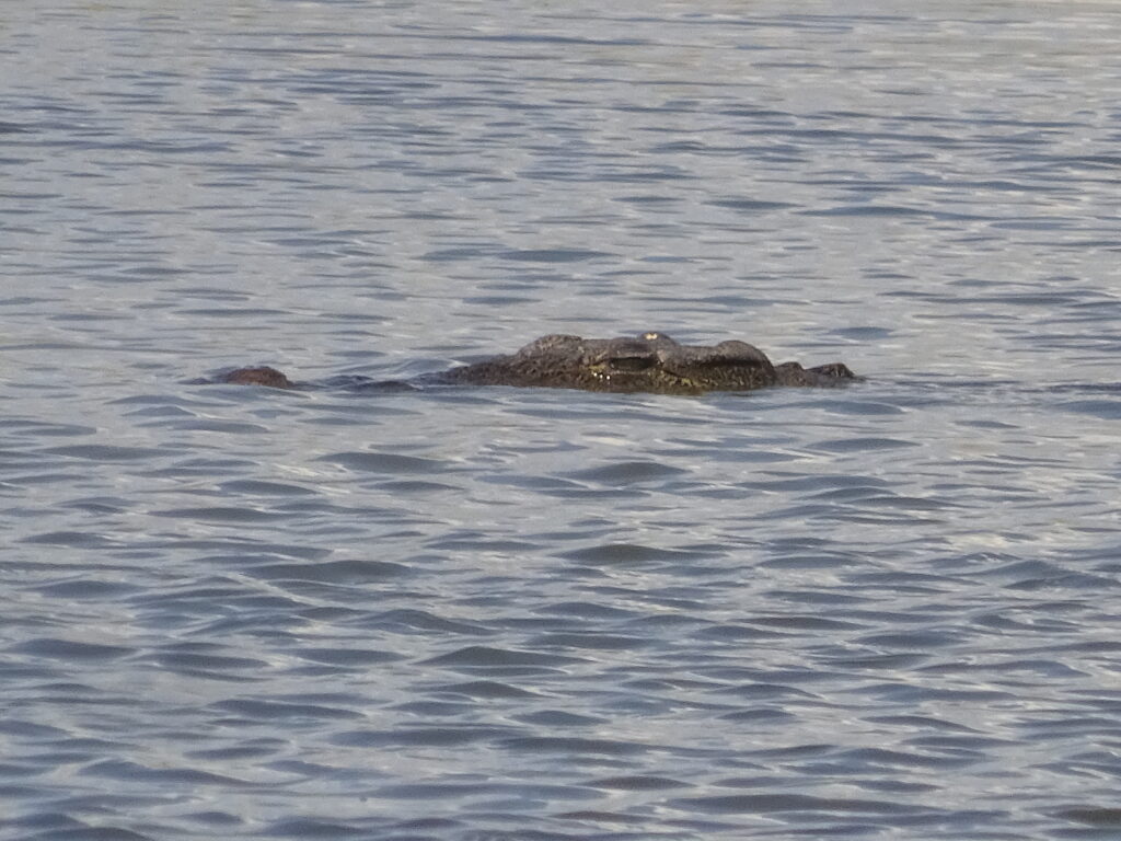 Von dort fuhren wir zur Schwesterlodge, da wir dort einen leichten Lunch einnehmen wollten (Tanakas Verantwortung) und am Nachmittag eine Bootstour mit einem Motorboot anstand. Obwohl sie den gleichen Besitzer hat, musste ich dort 5 Pula mehr für 500ml Wasser zahlen, was ich sehr seltsam fand – zumal es nicht offen ausgewiesen war. Um die Wartezeit auf das Lunch zu überbrücken gingen einige in den Mini-Pool, doch die meisten saßen einfach mit Getränken herum. Das Lunch bestand aus selbst zusammenzustellenden Wraps, was ok war. Die Bootsfahrt wurde in Absprache mit uns auf 14.30 Uhr vorverlegt, weil wir alle lieber im Anschluss in der eigenen Lodge ausruhen wollten. Wir bestiegen ein Motorboot, das seit Stunden in der Sonne gelegen hatte und keinen Sonnenschutz besaß. Die Sitze waren so heiß, dass wir auf den Schwimmwesten sitzen mussten, um überhaupt sitzen zu können. Stromaufwärts ging es los, rechts und links mit Stops für Vögel, Krokos oder Hippos. Am Wendepunkt gab es einen „Sundowner“, der auf eigene Kosten hatte mitgebracht werden können. Nun ja, wir waren zu früh für einen Sonnenuntergang, getrunken haben trotzdem alle etwas, da es einfach um uns herum brannte. Nach dem Anlegen des Bootes „vergaßen“ einige das Trinkgeld und nahezu alle eilten zum Bus. Aber halt, vorher noch die Getränke bezahlen, obwohl es vorher geheißen hatte, wir könnten sie in unserer eigenen Lodge bezahlen.