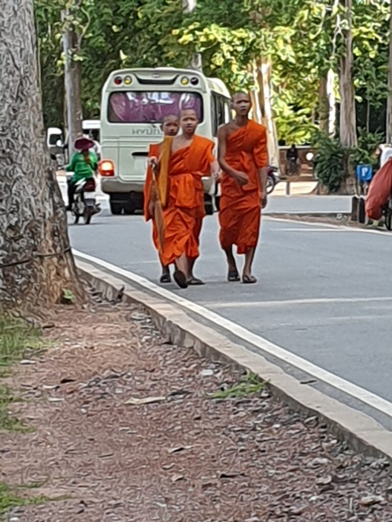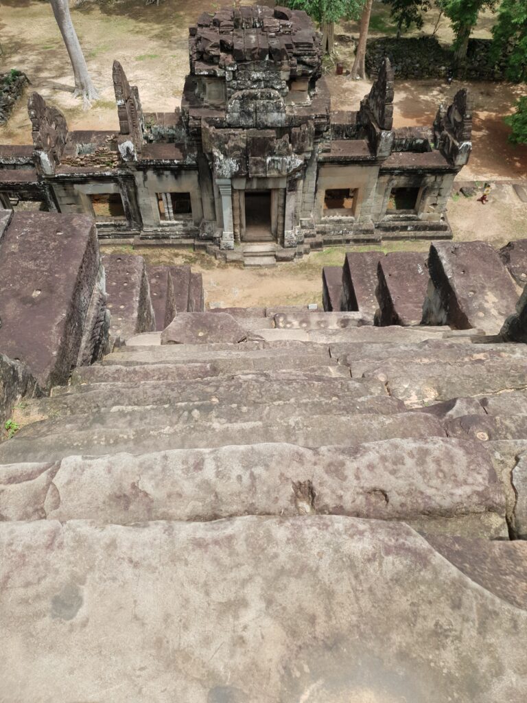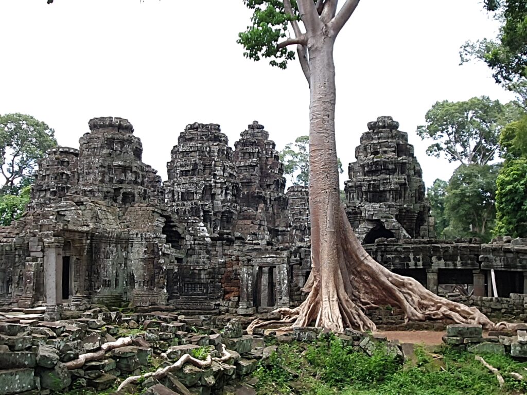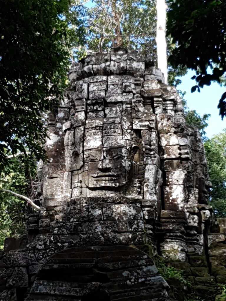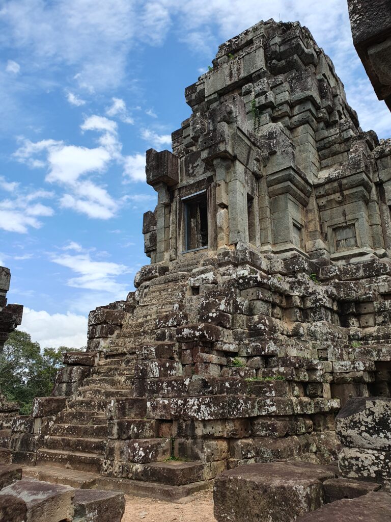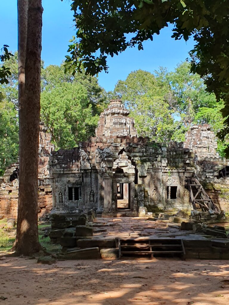Spätes Auschecken und langes Überlegen, was tun. Das bezahlte 3-Tagesticket für die Anlagen Angkor Wat zog: Mit Grab ein Tuktuk gerufen und zum ersten Tempel geordert (Banteay Kdei). Der war gar nicht so toll, aber dafür hatte ich meinen Fahrer für die nächsten Tempel und das Herumfahren gefunden. Wir steuerten fünf weitere, durchaus verschiedene Tempel an, von denen ich schon zwei kannte, bei denen ich nur nochmal Fotos mit etwas blauem Himmel machen wollte. Insgesamt waren wir etwa 4,5 h unterwegs. Bei einem Tempel (Pre Rup) führte ich auf der obersten Terrasse ein längeres Gespräch mit Noch-in-Deutschland S. Sehr erquickend und sonnenbruzelig. Dann ging es weiter mit meinem Tuktuk zu den anderen Tempeln, zuletzt zu einem ganz anders artigen, der auf einer Insel in einem Teich liegt. Anschließend kehrten wir nach Siem Reap zurück, wo es gerade wieder – typisch für spät nachmittags – zu schütten begann. Ich stellte mich im Wat Bo unter. Zwei kurze, heftige Duschen später lief ich zum Markt und kehrte noch nicht richtig hungrig, aber egal, in ein lokales Restaurant ein. Wieder zuviel (Reispapierrollen und eine Curry-Nudelsuppe), also ließ ich die Rollen als Take-away einpacken. Dann zurück zum Hotel am Supermarkt vorbeigehend, um dort Klamotten zu wechseln und die Zeit bis zum Aufbruch abzuwarten.