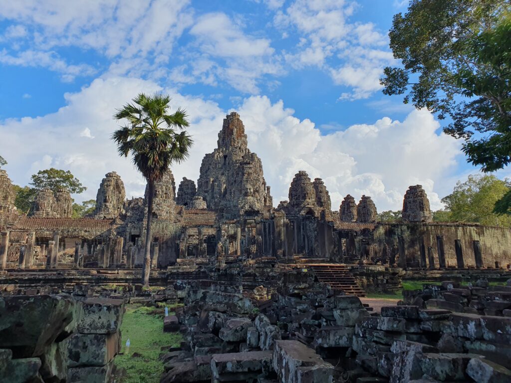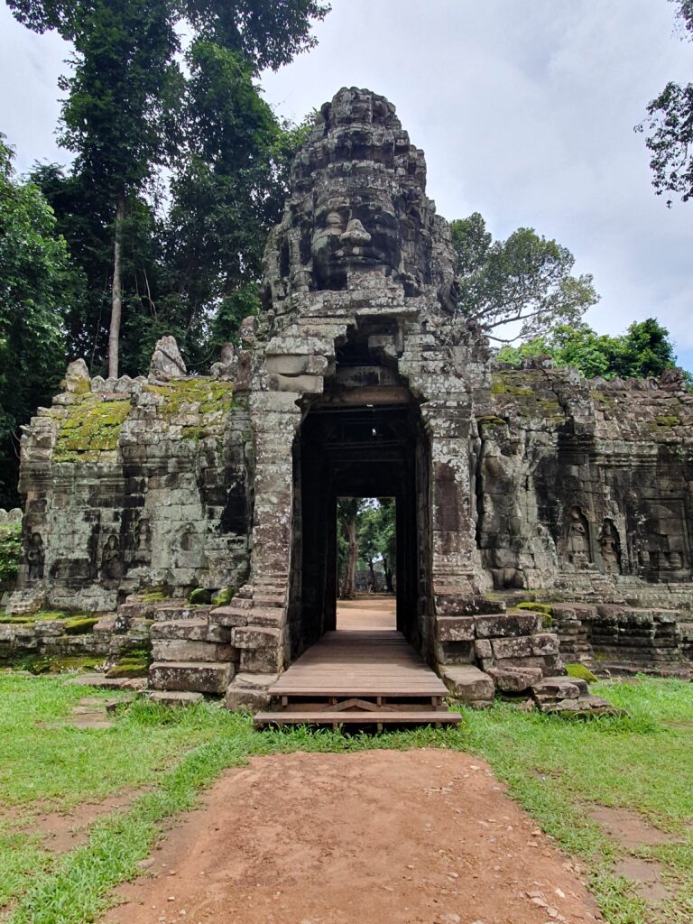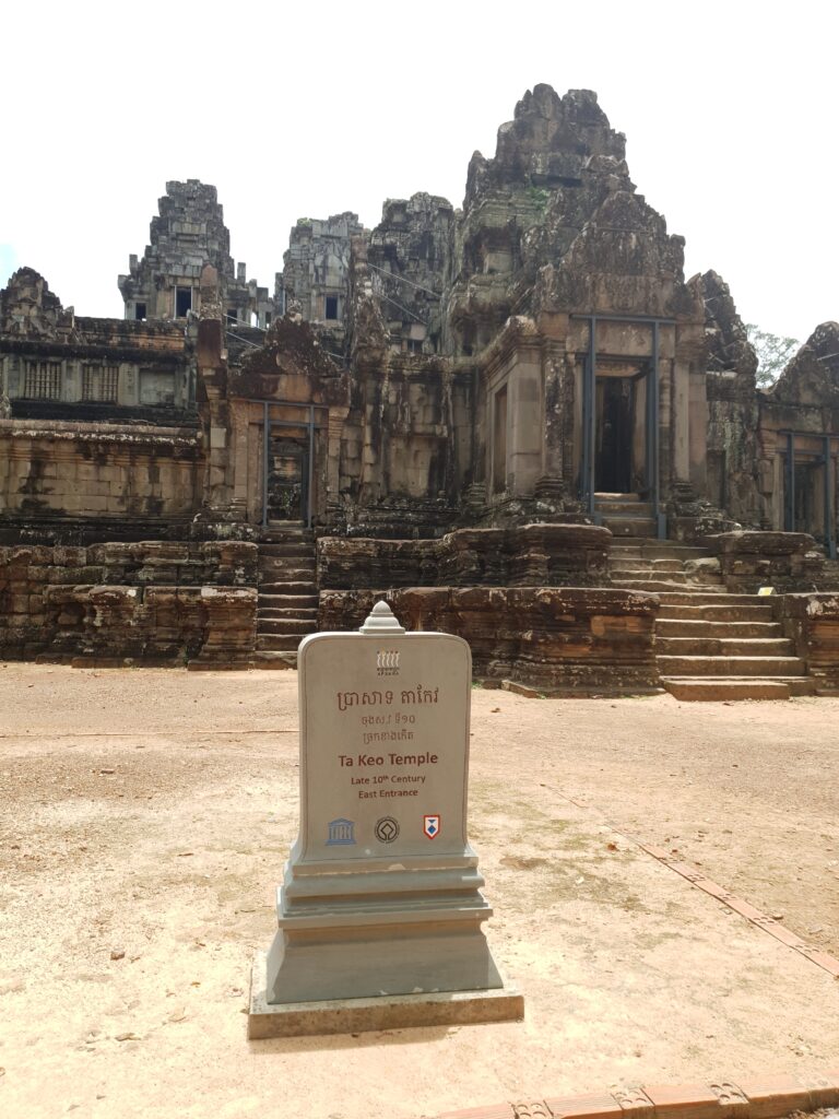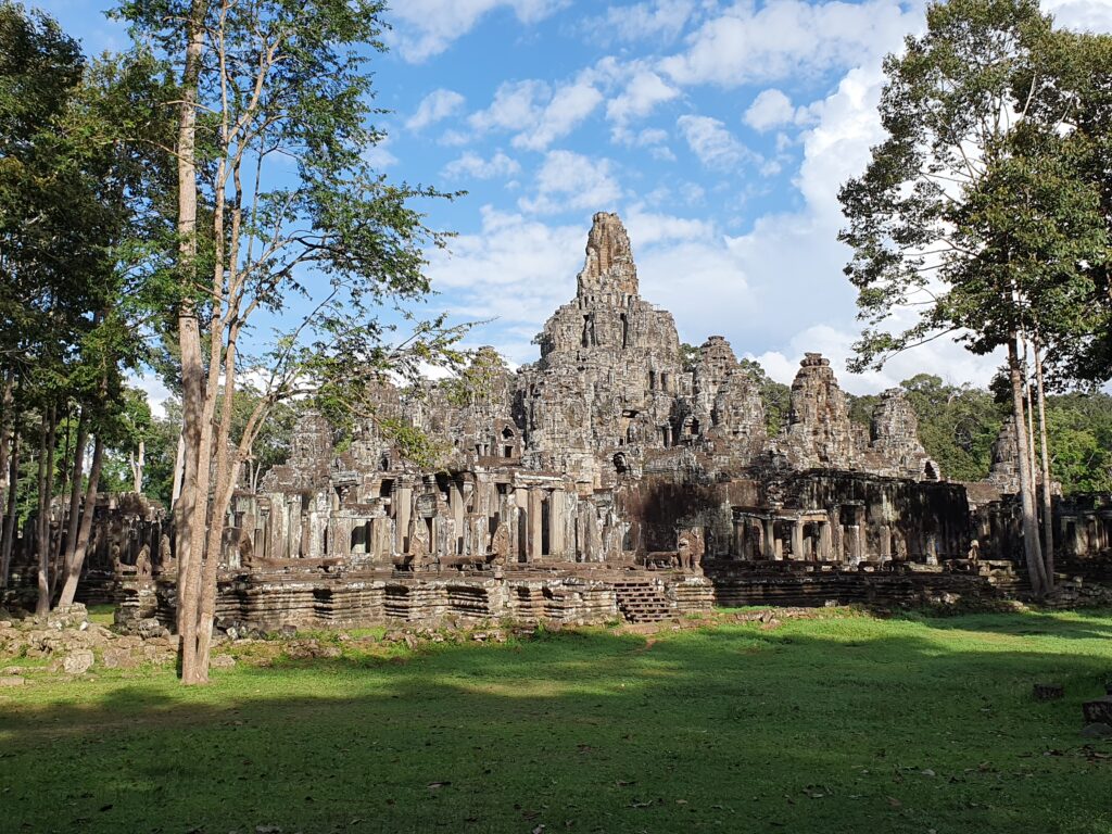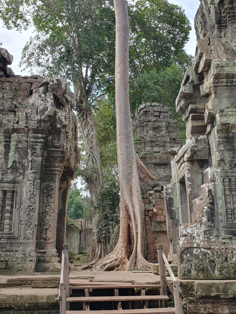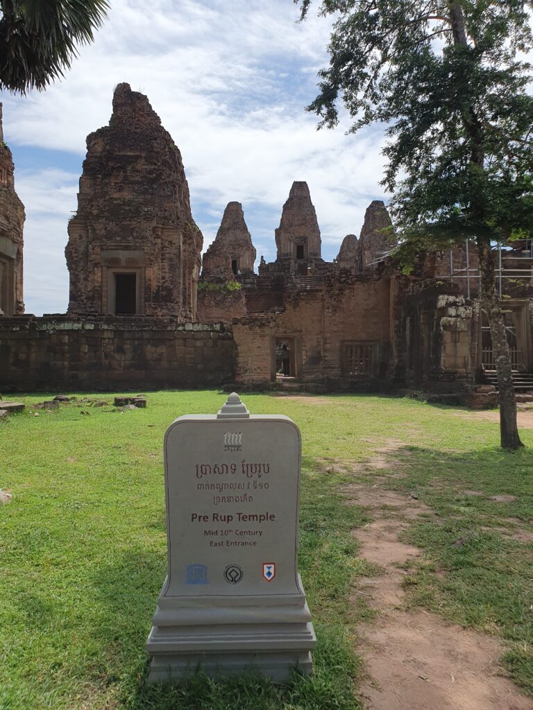 Spätes Auschecken und langes Überlegen, was tun. Das bezahlte 3-Tagesticket für die Anlagen Angkor Wat zog: Mit Grab ein Tuktuk gerufen und zum ersten Tempel geordert (Banteay Kdei). Der war gar nicht so toll, aber dafür hatte ich meinen Fahrer für die nächsten Tempel und das Herumfahren gefunden. Wir steuerten fünf weitere, durchaus verschiedene Tempel an, von denen ich schon zwei kannte, bei denen ich nur nochmal Fotos mit etwas blauem Himmel machen wollte. Insgesamt waren wir etwa 4,5 h unterwegs. Bei einem Tempel (Pre Rup) führte ich auf der obersten Terrasse ein längeres Gespräch mit Noch-in-Deutschland S. Sehr erquickend und sonnenbruzelig. Dann ging es weiter mit meinem Tuktuk zu den anderen Tempeln, zuletzt zu einem ganz anders artigen, der auf einer Insel in einem Teich liegt. Anschließend kehrten wir nach Siem Reap zurück, wo es gerade wieder – typisch für spät nachmittags – zu schütten begann. Ich stellte mich im Wat Bo unter. Zwei kurze, heftige Duschen später lief ich zum Markt und kehrte noch nicht richtig hungrig, aber egal, in ein lokales Restaurant ein. Wieder zuviel (Reispapierrollen und eine Curry-Nudelsuppe), also ließ ich die Rollen als Take-away einpacken. Dann zurück zum Hotel am Supermarkt vorbeigehend, um dort Klamotten zu wechseln und die Zeit bis zum Aufbruch abzuwarten.