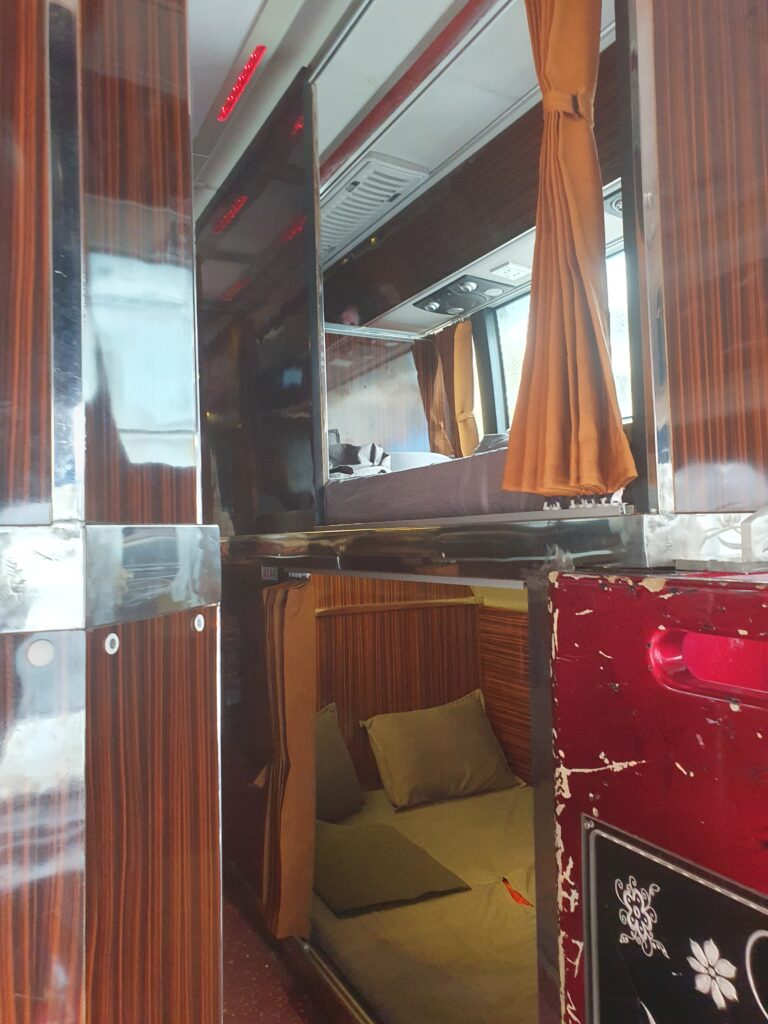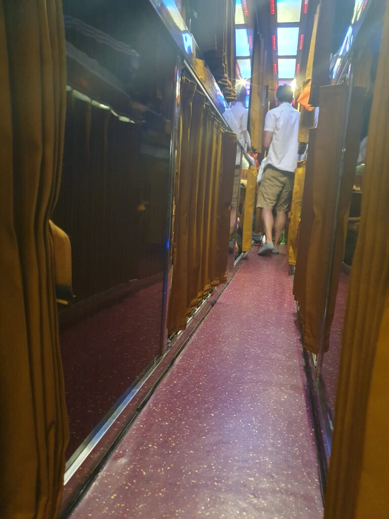 Wir fuhren ja so in der Nacht vor uns hin, meist schlafend und mit deutlich höherem Komfort als alle anderen, denn wir hatten ja jeweils die Doppelkoje gebucht. Die Normalgröße wäre 50cm breit und 178cm lang. Wer soll da schlafen können, vor allem neben fremden Personen? Um Reisekrankheit und Schlafmangel vorzubeugen, hatte ich eine halbe Schlaftablette genommen und schlief mit Musik bis etwa Phnom Penh morgens gegen 5.30 Uhr ganz gut. Auch danach sackte ich immer wieder weg. Gegen 7 Uhr gab es an einer Tankstelle eine WC-Pause, zu der sich viele rausdrängelten (max. 40 Personen passen in den Hotelbus). Ich zögerte zuerst, doch nach einem Blick auf die Karte – noch mind. 80km – kletterte ich doch noch aus meiner Koje, meine Schuhe einsatzbereit in der Hand. Schnell rausgehüpft und zum WC gespurtet. Doch herrje, nur z.T. West-WCs und kein Klopapier. Also zurück zum Bus, Papier geholt und dem Busbegleiter Bescheid gesagt, dass ich noch auf dem WC bin. Soweit alles in Ordnung, nur als ich wieder aus dem Häuschen komme, ist der Bus weg. Nein, nicht umgeparkt! Einfach weg! Und ich habe nur etwas Geld, meine Visacard und meinen Führerschein dabei. Alles andere ist im Bus. Insbesondere das Smartie für das Dolmetschen. PANIK!