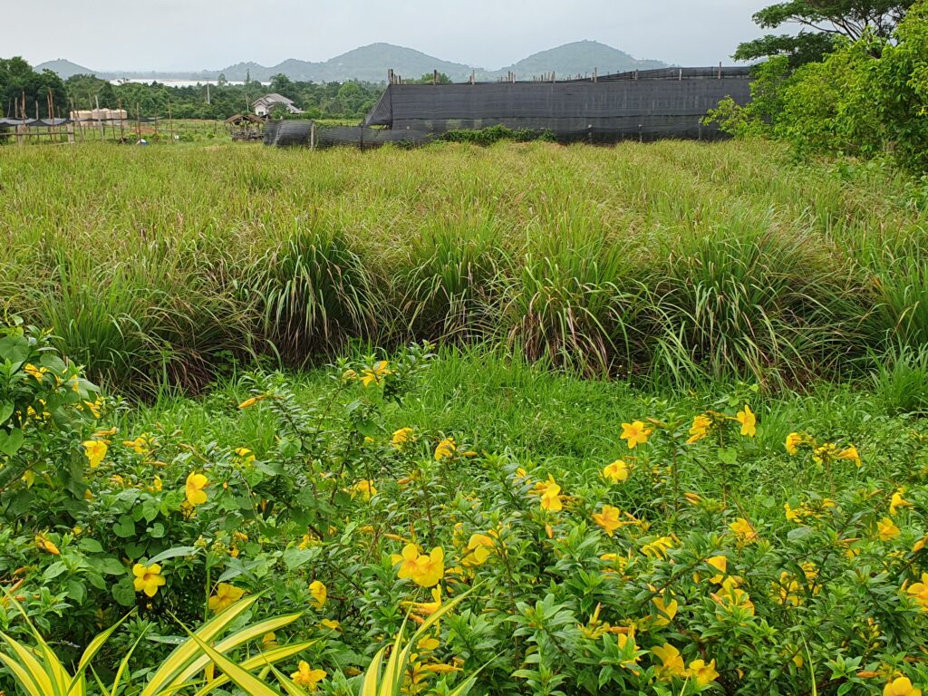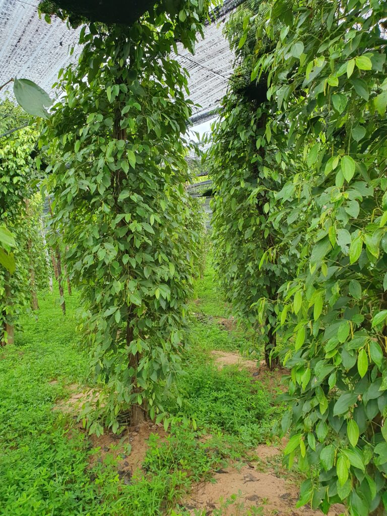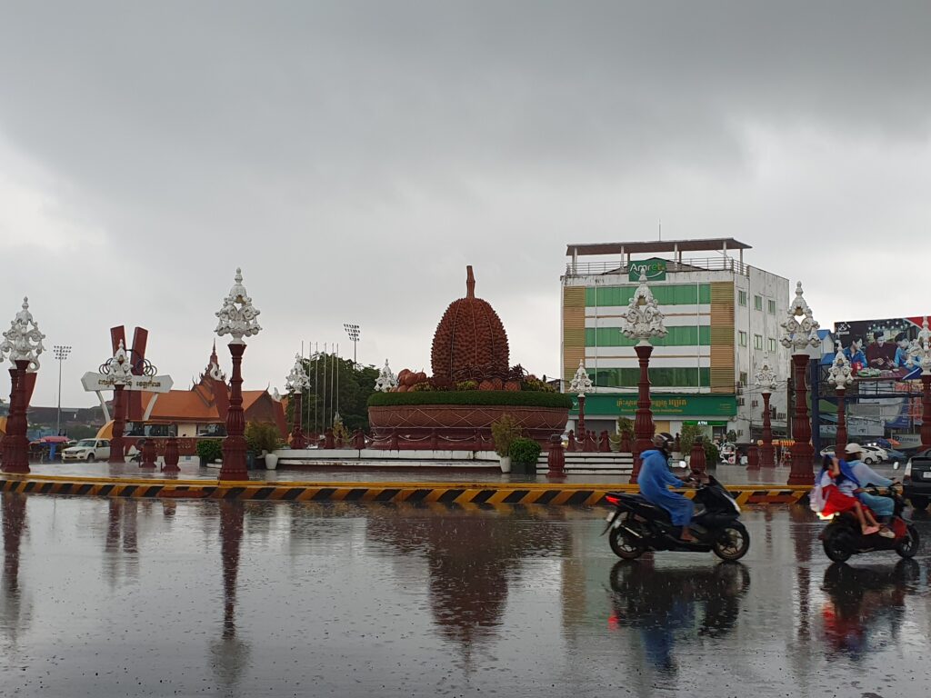 Kampot selbst ist echt kein Hingucker. Das Hotel leider auch nicht. In meinen Augen liegt im Verfall kein Charme. Sicherlich wurde der Eindruck noch durch die Sintfluten „gebiased“, die heute hier herunterkommen. Doch das ist es nicht allein. Im Nordwesten hatten Einheimische so getan, als ob der Südwesten so viel weiter entwickelt und daher auch teurer wäre, doch nach heute würden wir das nicht so sehen. Alles einfach nur trüb und auf Halligalli ausgerichtet. Das Wichtigste hier haben wir uns aber heute nachmittag gleich angesehen: La Plantation, eine Pfefferplantage, über die auch in einer Doku berichtet wurde. Interessante Führung, Pfefferverkostung und Shop. Ruckelige und einmal dem Umstürzen gefährlich nahe Tuktukfahrt über Land hin und zurück (ca. 22,5 km pro Strecke). Anschließend Essenssuche rund um den Kreisverkehr mit einer Durian in der Mitte. Symbol von Kampot, das sagt eigentlich alles. Denn eine Durian heißt im Dt. Stinkfrucht!