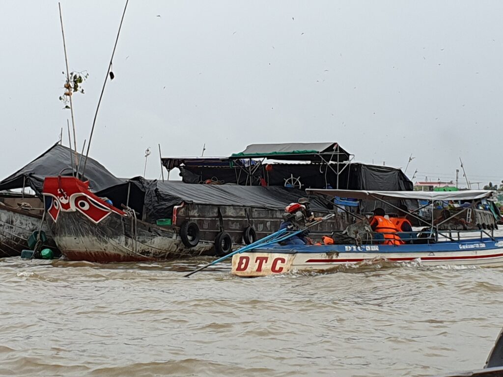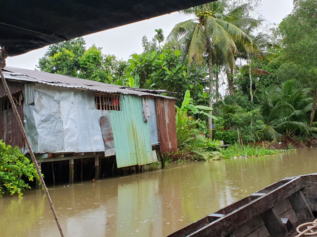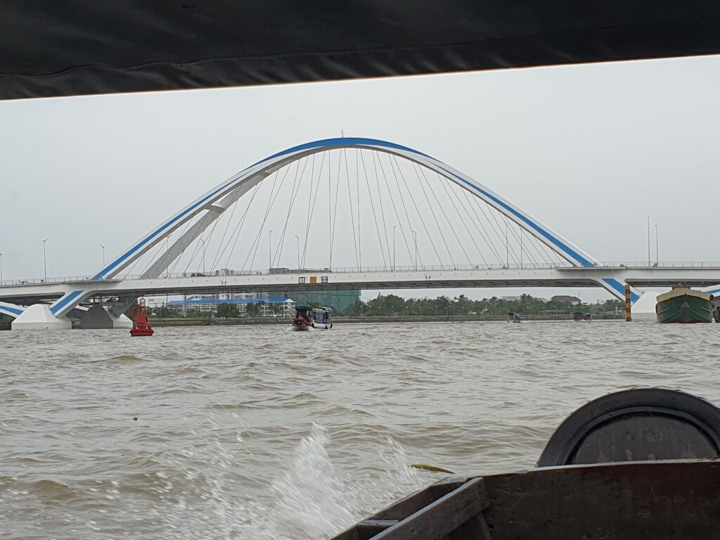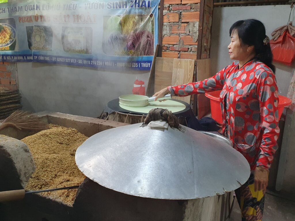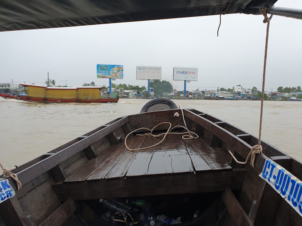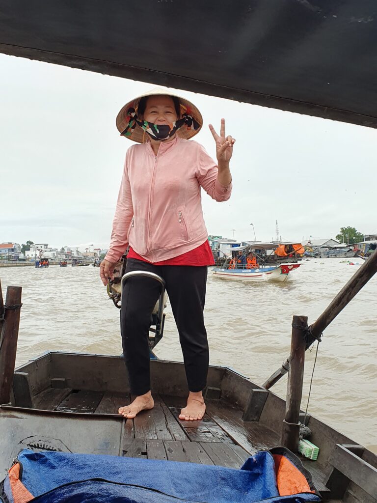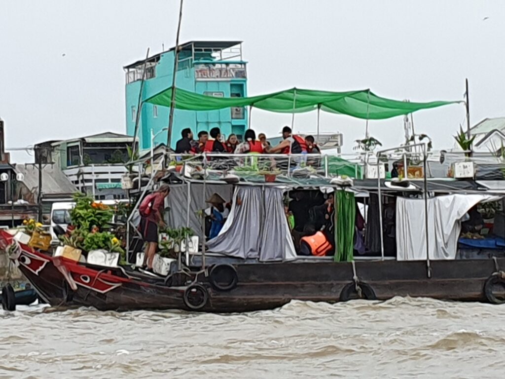 Wir fuhren los und genossen die Bummelei auf dem Fluss, auch wenn wieder etwas Regen einsetzte, der kommen und gehen sollte. Als wir zu unserem Ziel, den schwimmenden Märkten, kamen, waren wir enttäuscht. Es gab eigentlich keinen Handel unter den Einheimischen, sondern nur den Wunsch, an die Touristen Lebensmittel zu verkaufen. Das hatte sich in verschiedenen Quellen anders angehört. Allerdings waren wir wohl auch nicht bei dem besten Markt für so etwas und vor allem zu spät – das geht auf mein Konto. Ich hatte einfach nicht um 5.30 Uhr am Kai stehen wollen. Doch beim Nachlesen am Mittag stellte ich fest, dass diese Märkte alle zwischen 5 und 7 Uhr besonders betriebsam sind. Naja, wir hatten eine erholsame Fahrt mit einem Abstecher zu einer Nudelfabrik (Nudeln aus Reispapier) und einen Nebenarm des Can Tho (, das war schon eher ein Tourinepp, da es ein toter, kurzer Flussarm ohne „Inhalt“ war). Doch es war zumindest teilweise ruhig auf dem Wasser, sieht man von den anderen Touribooten ab. Die Entschleunigung tat uns beiden gut.