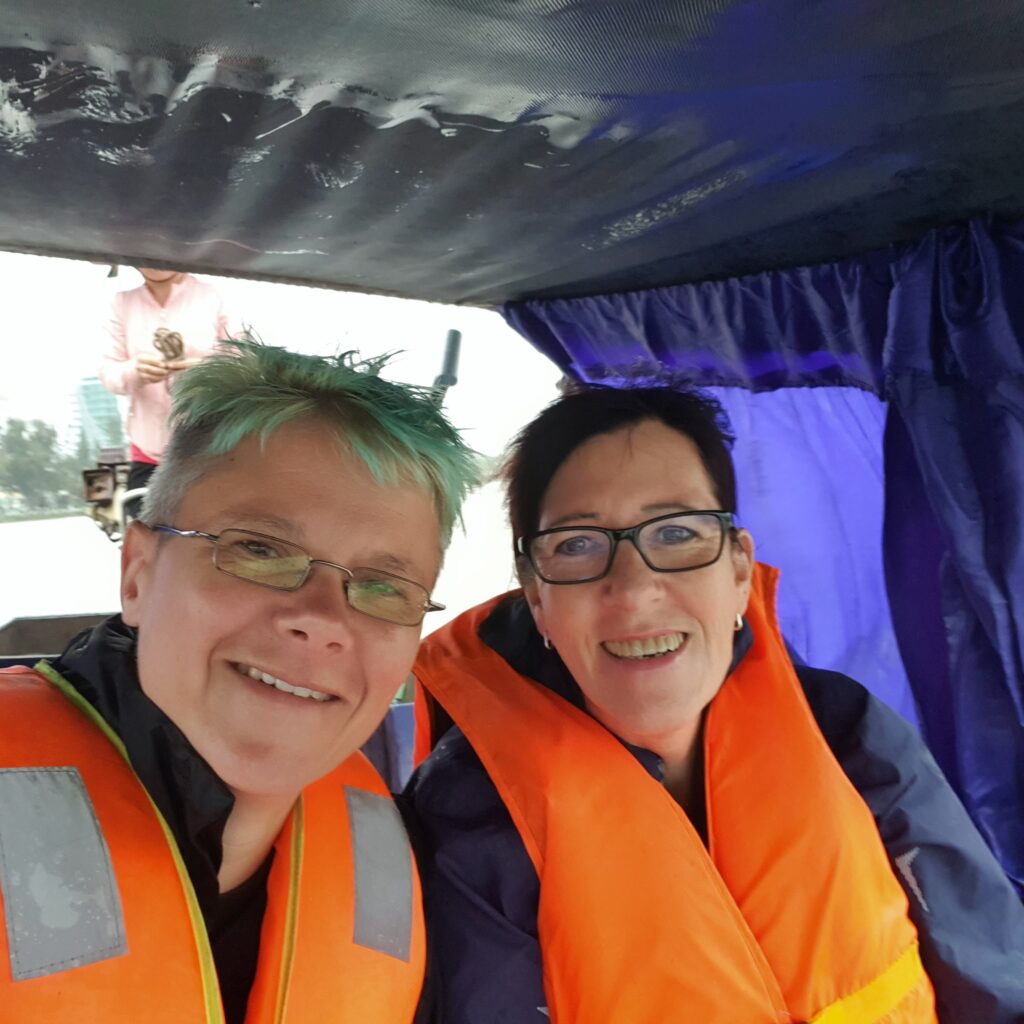 Um kurz vor sieben schlugen wir an unserem Bootsstand auf. Die Inhaberin wartete schon und verwies uns an ihre Bootsführerin. Wir kletterten über die Brüstung ins motorisierte Holzboot, das wir für drei Stunden unser eigen nennen sollten. Es hatte erfreulicherweise einen Regen(/Sonnen)schutz mit der Möglichkeit, die Seiten ebenfalls zuzuziehen. Gut so, es hatte morgens mal wieder extrem geschüttet.