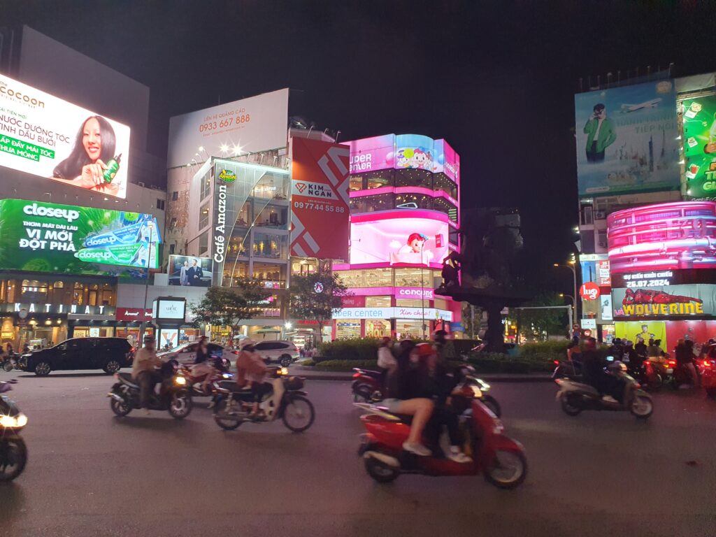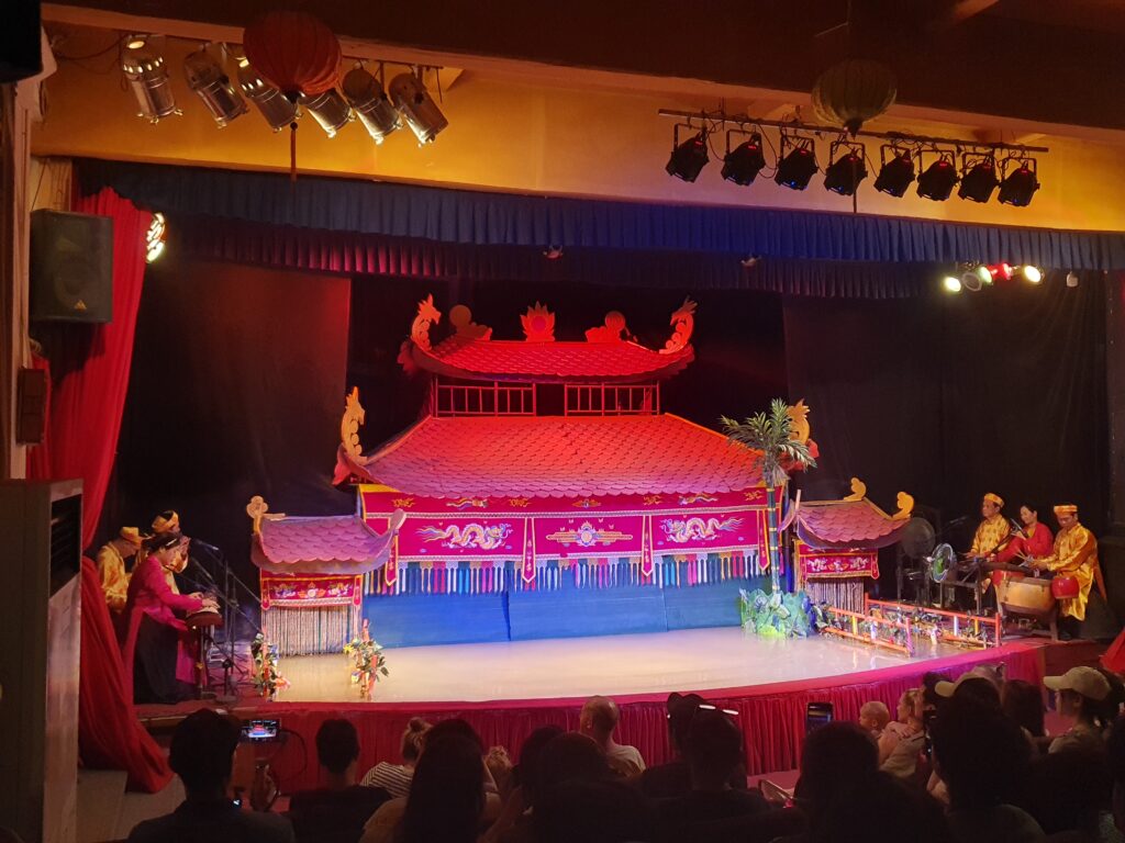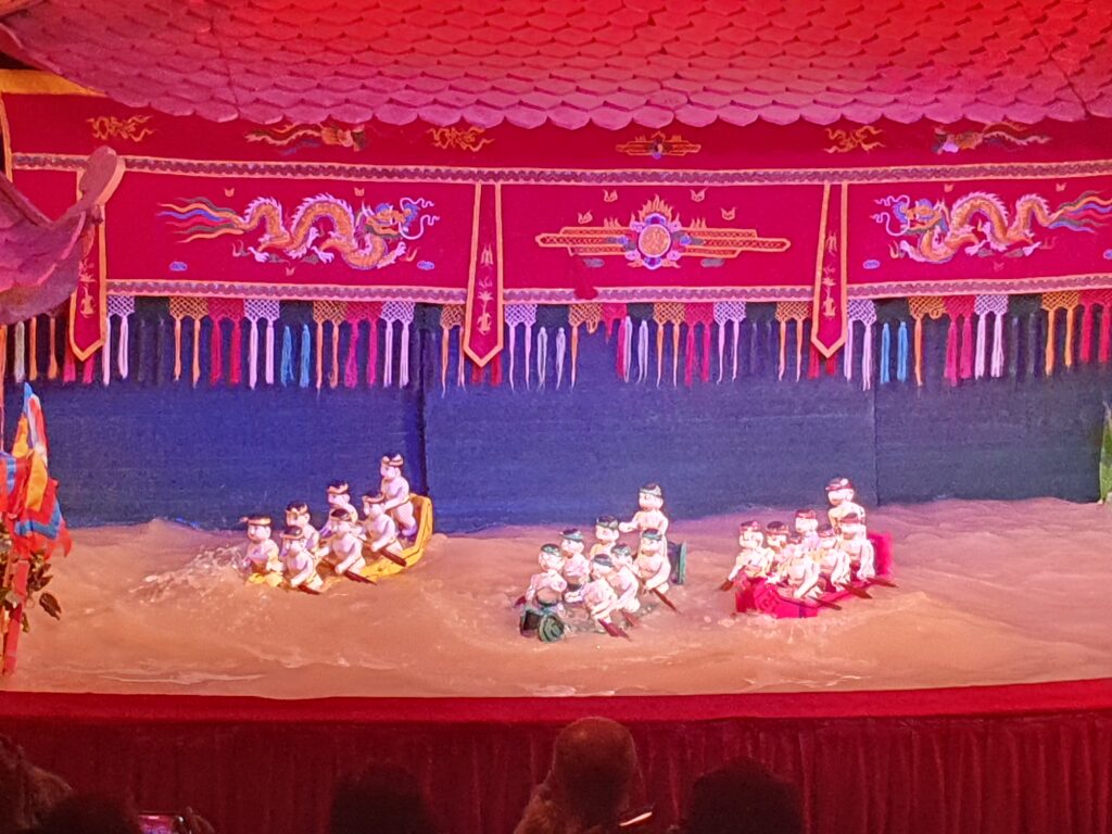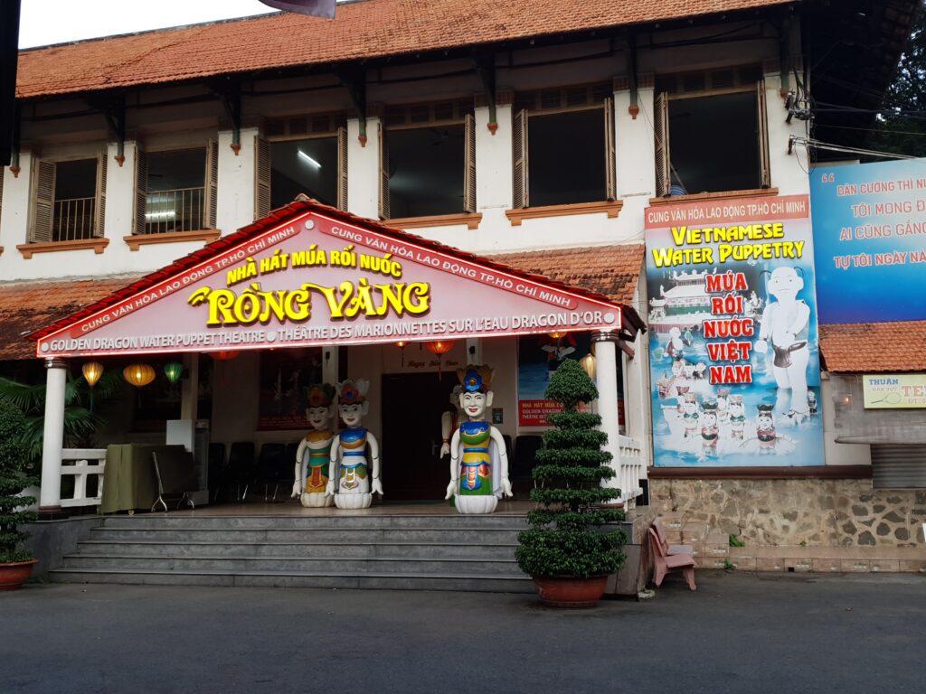 Frühstück auswärts mit Croissant und Schokolade an der Flußstraße, dann auschecken und mit einem Grab zu einem Transportunternehmen mit klimatisierten Vans. Tja, leider konnte man zurecht auf 12go.asia keine Tickets mehr buchen. Wir könnten erst einen Platz um 12 Uhr erhalten. Grr! Doch dank der Hilfe eines Mitarbeiters vor Ort saßen wir gleich darauf wieder in einem Grab und fuhren zum zentralen Busbahnhof. Riesig und drinnen kaum Schalter besetzt. Und wenn, spricht nahezu keiner auch nur einzelne Brocken Englisch. An einem hätte ich fündig werden können, doch auch erst mit Abfahrt um 11 in einem Sleeperbus. Meine Frage nach Minibussen verstand die Verkäuferin nicht. Aber ich gab mich nicht geschlagen, sondern tingelte zuerst im Bahnhofsgebäude, dann draußen herum. Es musste doch diese Busse geben! Und ja, in der Tat, vor der Hintertür fiel ich quasi über die gesuchten Busse. Und einer der Betreiber über mich. Wir passten zusammen: Minibus mit Minipreis nach HCMC gleich um 10 Uhr. Schnell holten wir das Gepäck und Angelika aus dem Terminal und los ging es. Nicht voll besetzt noch klimatisiert, doch meine Wenigkeit direkt vor einem Schiebefenster. „Frische“ Luft war gesichert. Die Fahrt war rasant, brachte ein paar Passagieränderungen mit sich und demonstrierte gut, was alles mit diesen Bussen verschickt wird: Menschen, Pakete oder Hahn mit Hühnern in Kartons (da saßen wir fast drauf). Es krähte immer mal wieder lustig. Wir erreichten HCMC in nur 3.5h, sehr schnell wurden wir am Westbahnhof abgegeben. Während wir noch die Rücksäcke schulterten, war der Bus schon weg. Mit einem Grab ging es zum Hotel in Distrikt 1. Nach etwas Suchen fanden wir es auch in der benachbarten Straße, da google hier nicht so ganz richtig lag. Nach dem Abwerfen der Sachen gingen wir etwas essen (leckere Pizza) und dann spazierten wir herum. Dabei kamen wir auch wie beabsichtigt am Golden Dragon vorbei und erwarben noch Karten für die Abendvorführung des vietnamesischen Wasserpuppentheaters – traditionell seit dem 11.Jh. überliefert. Die Show war gut (nicht lang, nur 45min), wenn auch die Musik für unsere Ohren gewöhnungsbedürftig war. Das spiel der Puppen wird von einem Sextett instrumentell sowie mit Gesang und Sprache begleitet.