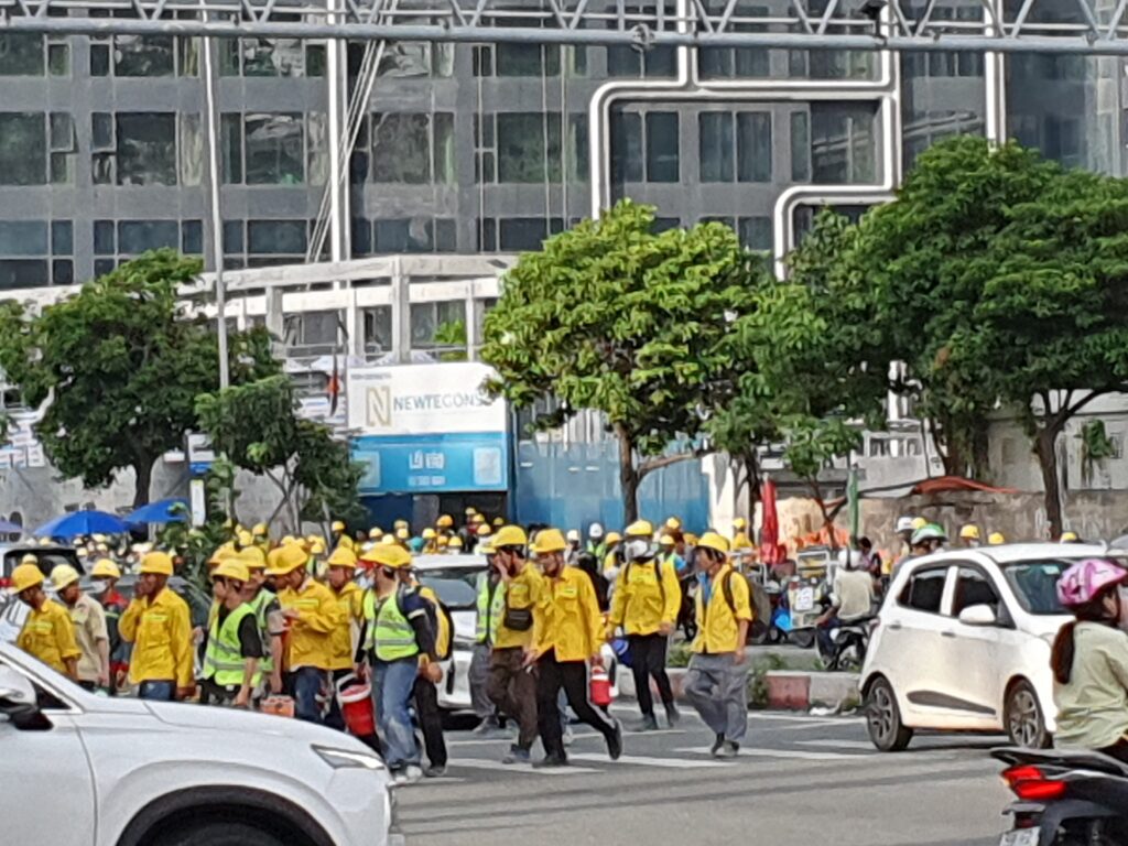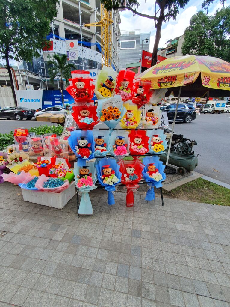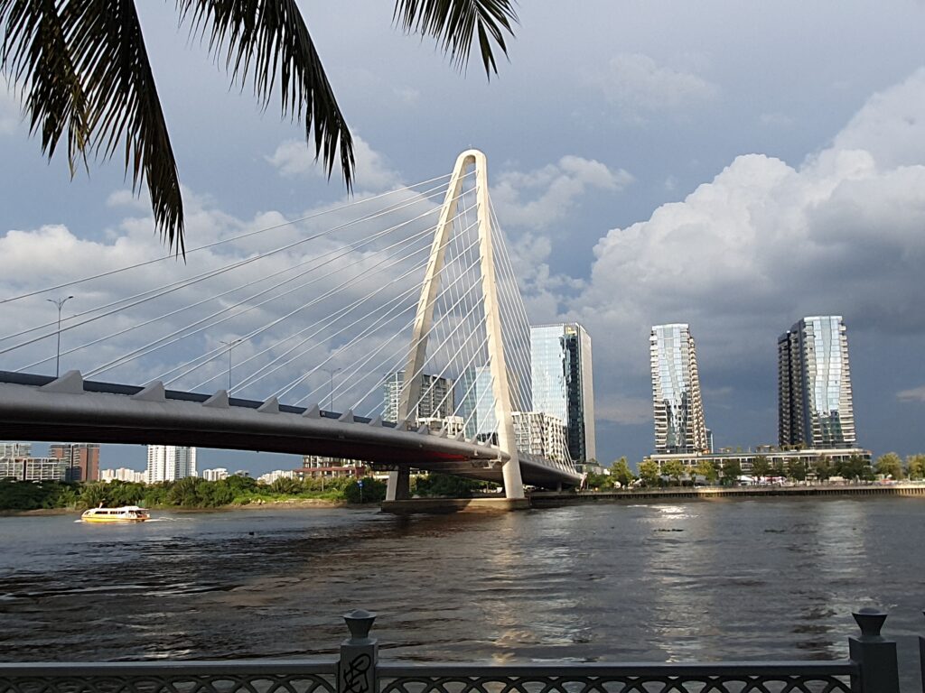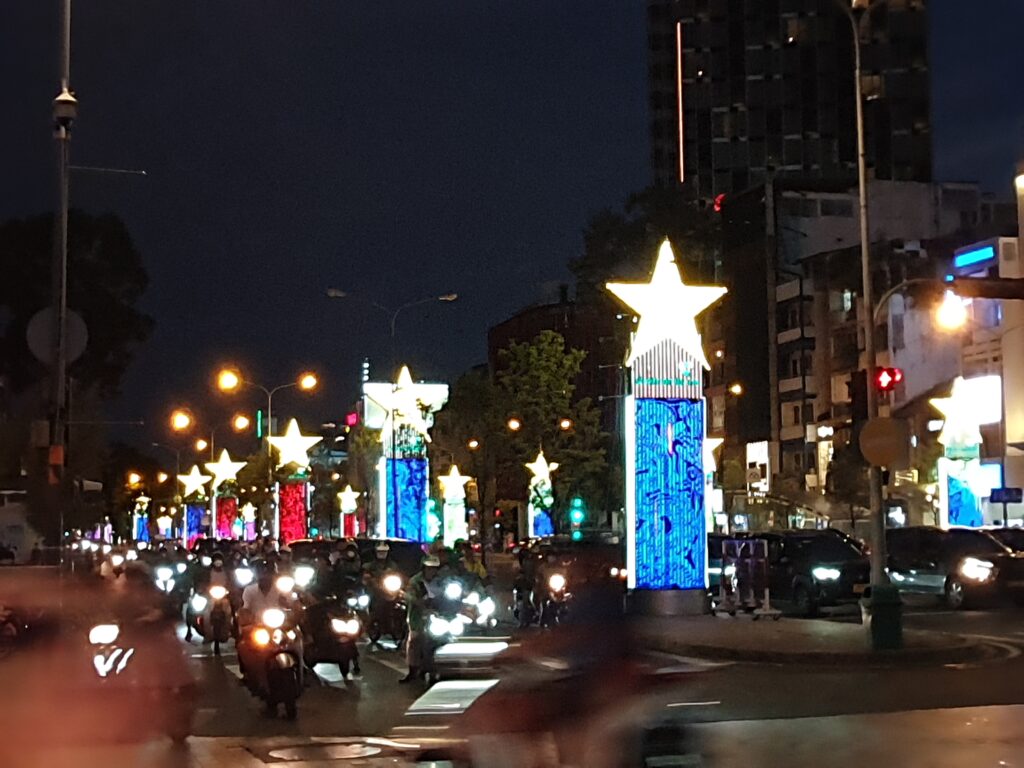 Wieder draußen liefen wie an einer Monsterbaustelle entlang, aus der gerade gefühlt hunderte Arbeiter herausströmten. Als ob sich das Nest gar nicht leeren wollte. Wir passierten einen Kindergarten mit einer umfangreichen, bunten Mauerbemalung, unterquerten eine riesige Brücke und erblickten enorme Skyscraper-Viertel entlang des Flusses. An diesem marschierten wir weiter und immer weiter, da der angrenzende Boulevard für Fußgänger unpassierbar war. So kamen wir schließlich wieder bei der Brücke vom Morgen an, die Gustave Eiffel erbauen ließ. Inzwischen waren wir extrem durstig (nach etwas Kaltem), durch und durch geschwitzt und doch auch etwas hungrig. Wir kämpften uns weiter über Bürgersteige, die zum Parken der Mopeds und für Mini-Garküchen etc. genutzt werden, und über chaotische Straßen, auf denen Mopeds auch aus der falschen Richtung (bei Einbahnstraßen) auf einen zuströmen. An eine Fruchtsaftbar legten wir eine verdiente Pause ein und beobachteten sowohl die Leute als auch das sich anbahnende Gewitter. Da aber dann doch kein Regen kam, kehrten wir zum Hotel zurück und nahmen uns auf dem Weg noch eine Pizza mit, die wir auf der Dachterasse unseres Hotels vertilgten. Hier suchten wir auch unser Hotel für die nächsten Tage in Da Lat heraus und entschieden, morgen piano zu machen.