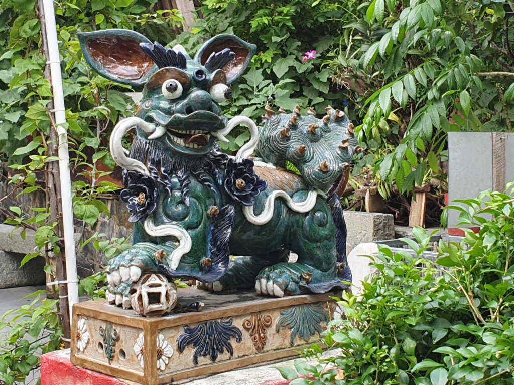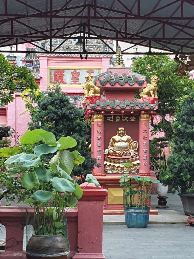 Im Anschluss eilten wir für einen Zwischenstop ins Hotel zurück. Wie gesagt, Magen etc. Außerdem ist es geradezu himmlisch, wenn man sich mal die Hände waschen kann, weil einfach alles nur klebt. Am frühen Nachmittag brachrn wir zur 3km entfernten Jade Pagode des Kaisers (China) auf. In ihr sind Taoismus, Buddhismus und Hinduismus vereint. Auf dem Weg legten wir eine Rast in einem weiteren Stadtpark ein und genossen die Entfernung von den Straßen, auf denen es IMMER rauscht und hupt. Wir sind inzwischen auch dazu übergegangen, den Laufweg nach der Anzahl der zu überquerenden Straßen auszurichten. Je größer oder gar an einem Kreisverkehr gelegen, desto wahrscheinlicher ist eine lebensgefährliche Überquerung! Man braucht hier viel Souveränität, ein gutes Auge und wohlsortierte Nerven. Der Tempel oder wie meine OSM-Karte sagt, die Anbetungsstätte, war klein, jedoch durchaus sehenswert und gut von Einheimischen besucht. Es gab nahezu keine Touristen außer uns, was der Stätte sehr gut tut.