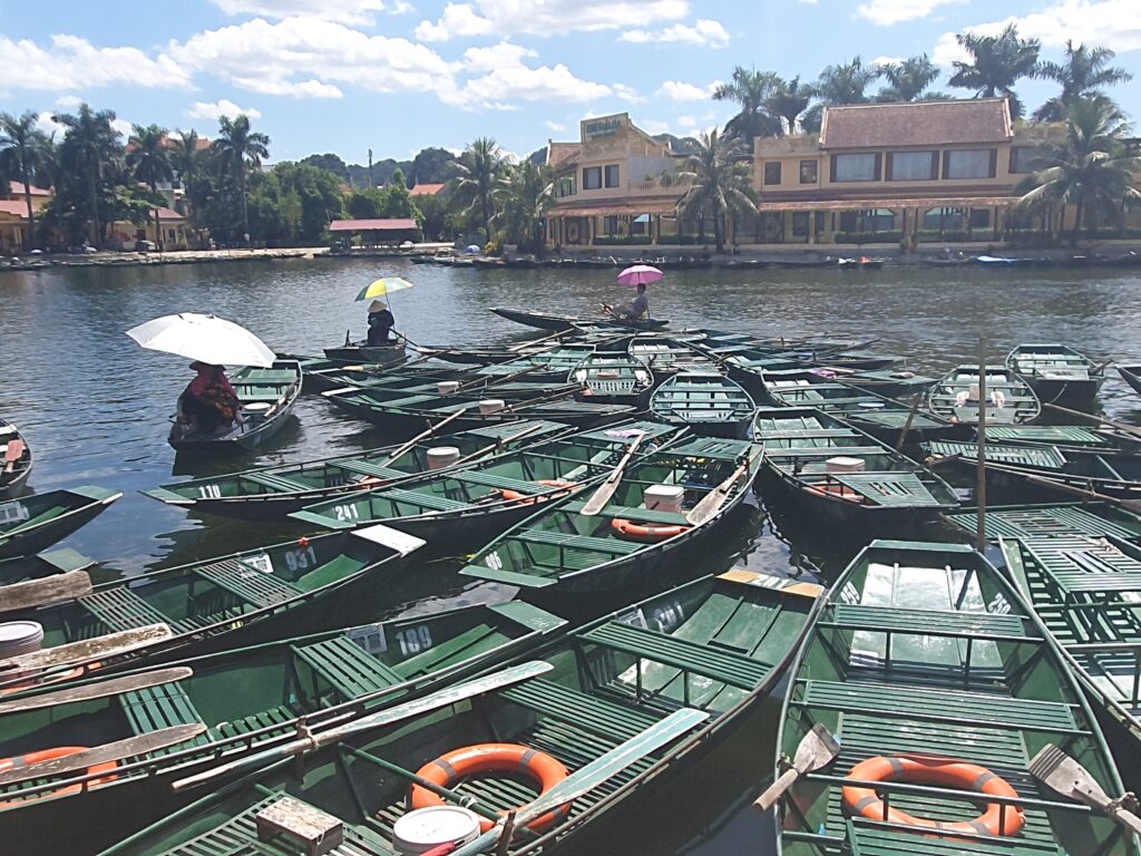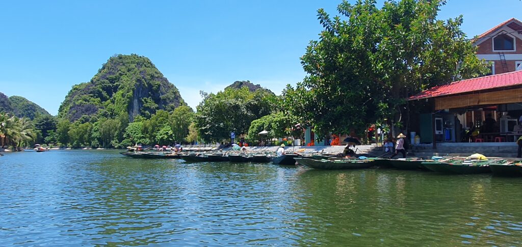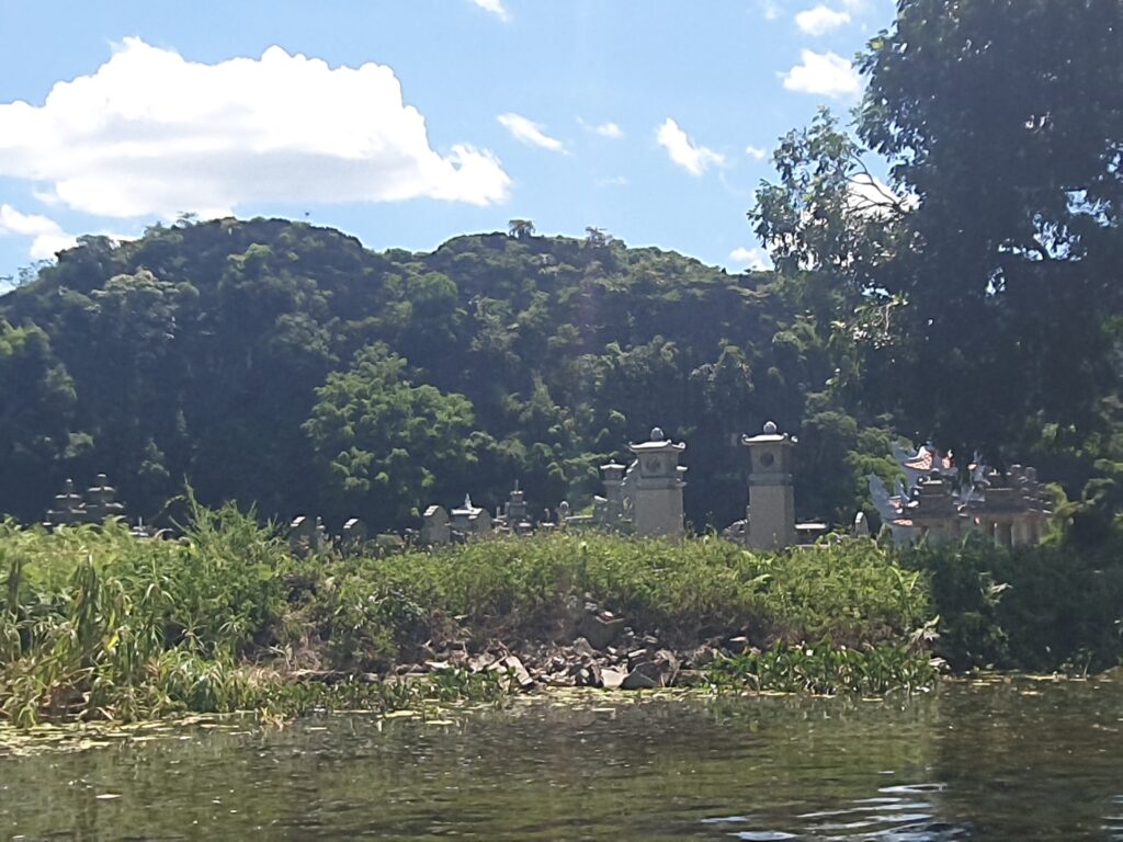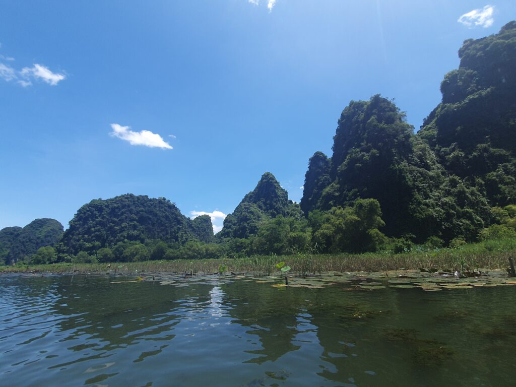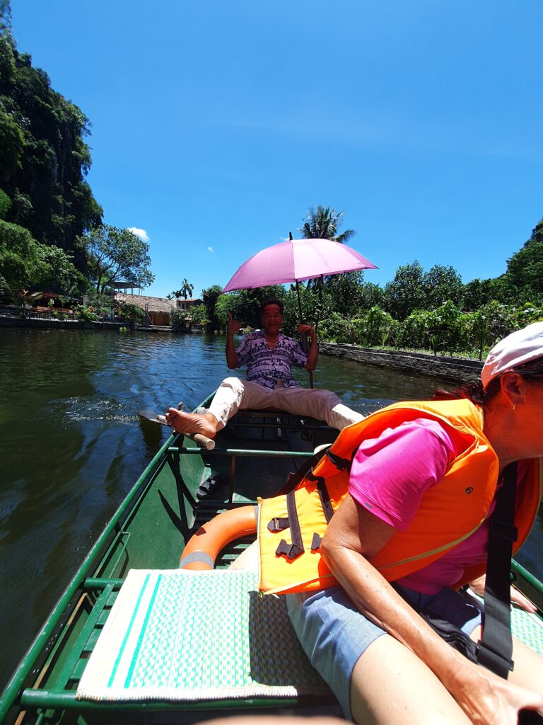 Morgens um kurz nach neun kamen wir ausgeschlafen und ziemlich pünktlich in Ninh Binh an. Vor dem Bahnhof kam es zum üblichen „Prügeln“ der Taxifahrer um die Ankommenden. Einen wurden wir nicht los. Dieser beuhauptete außerdem, dass es hier kein Grab gebe. Die App schien auch recht lange nach einem Auto zu suchen. Also ließen wir uns kapern und zu unserem Hotel in Tam Coc bringen. Dort konnten wir schon in ein Zimmer einziehen und so uns etwas frisch machen. Anschließend ging es auf Futtersuche. Das erledigt entschieden wir uns für einen gemütlichen Fortgang der Dinge: Bootsfahrt im kleinen Karstgebirge direkt von Tam Coc aus. Es folgten schöne, sonnige 1,5h Ruderbootfahrt, bei der der Bootsführer mit den Füßen die kurzen Ruder bediente. Sie fahren quasi Farrad auf dem Wasser! Bei der Tour durchquerten wir auch einige Höhlen und sahen faszinierende Steinformationen. Und noch etwas Angenehmes: Es war nicht so voll.