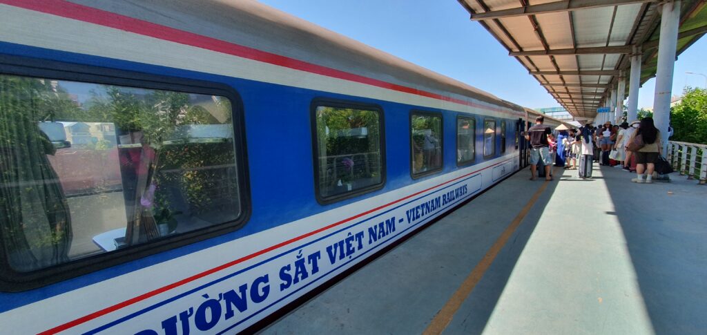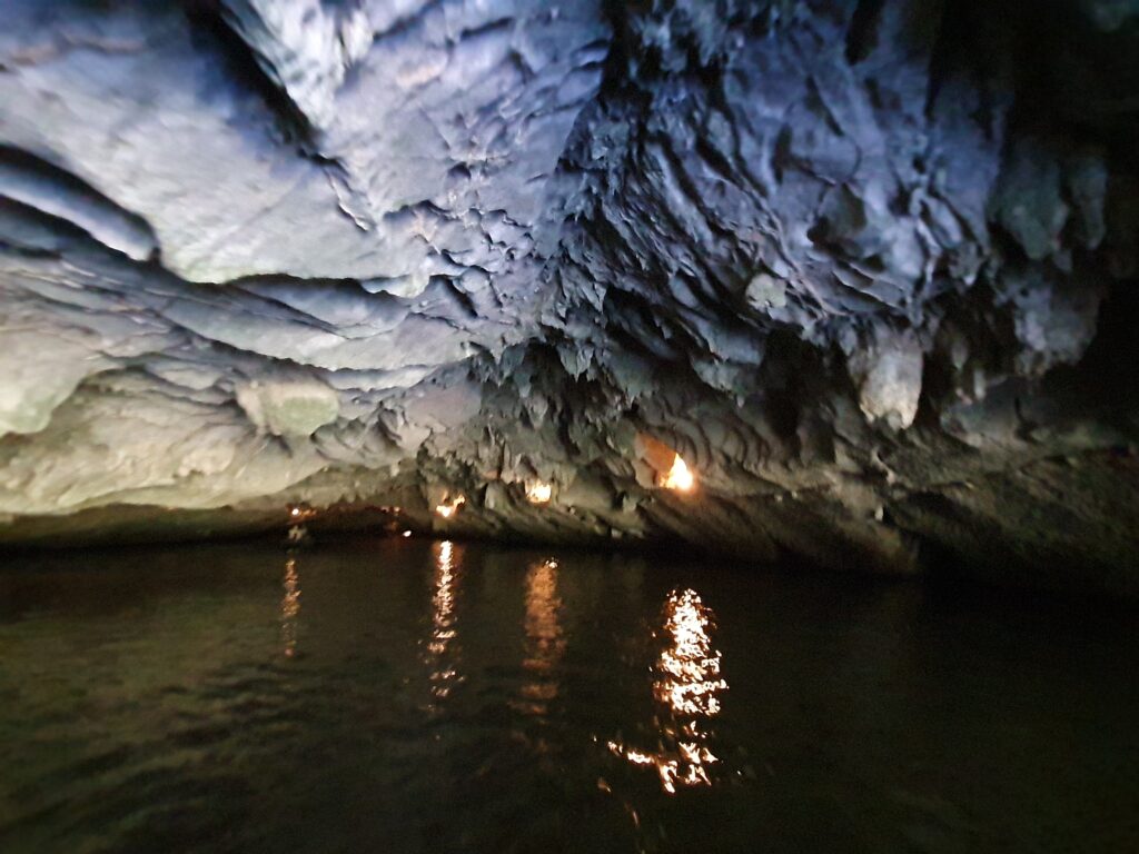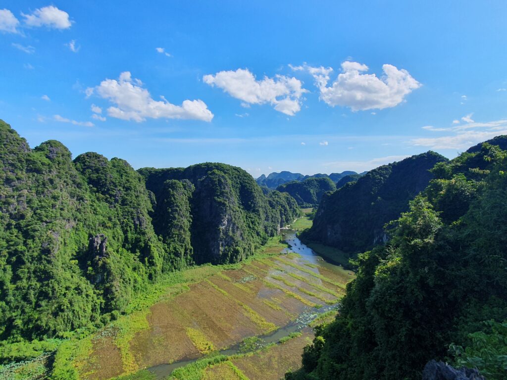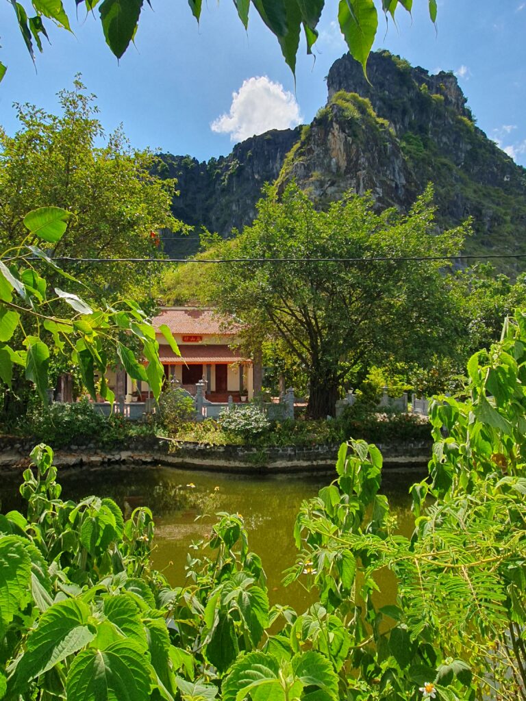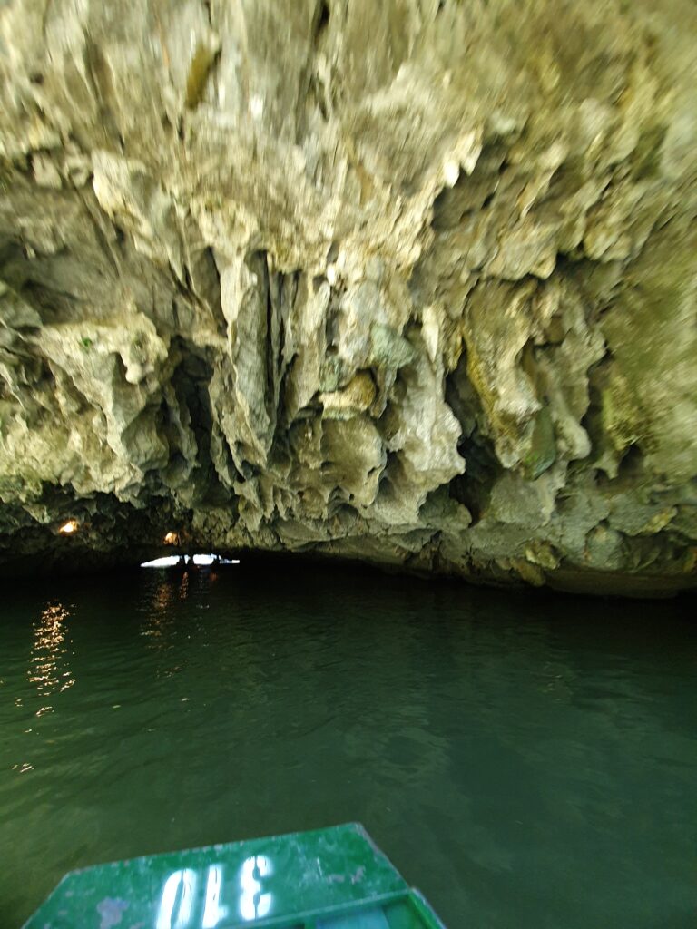 Morgens um kurz nach neun kamen wir ausgeschlafen und ziemlich pünktlich in Ninh Binh an. Vor dem Bahnhof kam es zum üblichen „Prügeln“ der Taxifahrer um die Ankommenden. Einen wurden wir nicht los. Dieser beuhauptete außerdem, dass es hier kein Grab gebe. Die App schien auch recht lange nach einem Auto zu suchen. Also ließen wir uns kapern und zu unserem Hotel in Tam Coc bringen. Dort konnten wir schon in ein Zimmer einziehen und so uns etwas frisch machen. Anschließend ging es auf Futtersuche. Das erledigt entschieden wir uns für einen gemütlichen Fortgang der Dinge: Bootsfahrt im kleinen Karstgebirge direkt von Tam Coc aus. Es folgten schöne, sonnige 1,5h Ruderbootfahrt, bei der der Bootsführer mit den Füßen die kurzen Ruder bediente. Sie fahren quasi Farrad auf dem Wasser! Bei der Tour durchquerten wir auch einige Höhlen und sahen faszinierende Steinformationen. Und noch etwas Angenehmes: Es war nicht so voll.