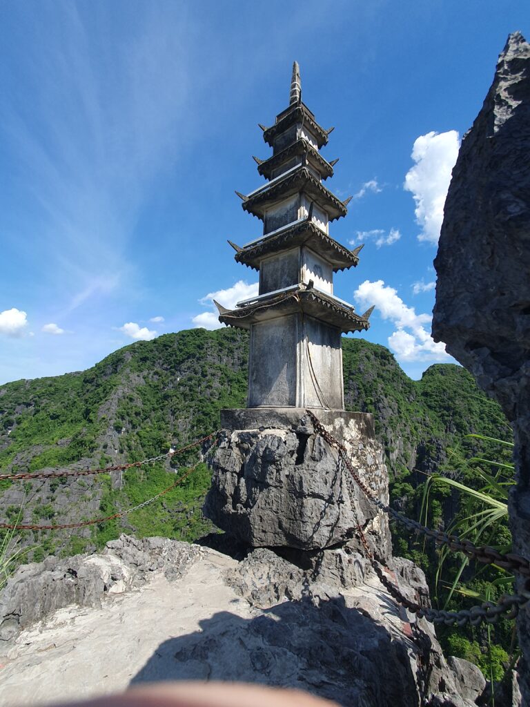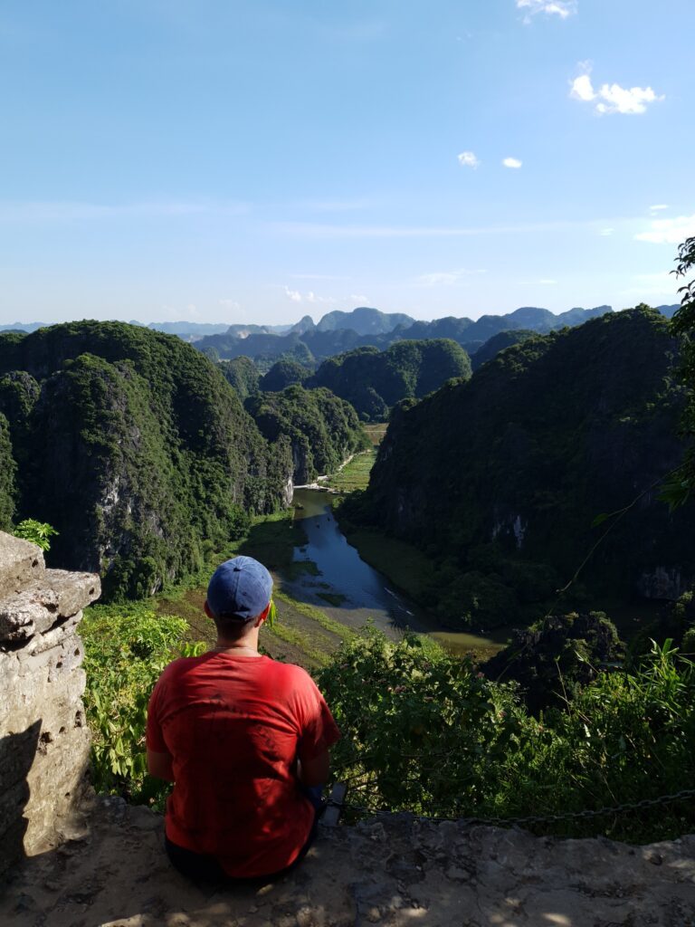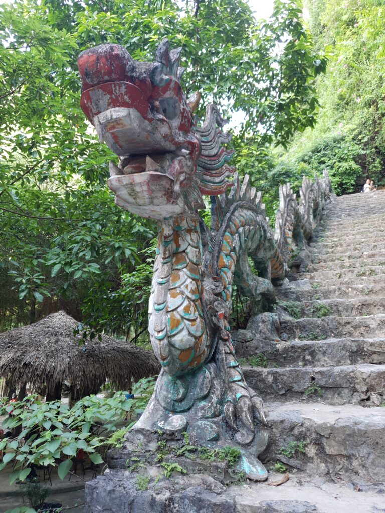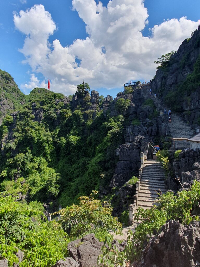 Am frühen Nachmittag trafen wir wieder im Hafen ein und wollten nun die Wanderung nach Hang Mua in Angriff nehmen. Noch etwas Wasser nachgekauft und raus aus dem Ort, durch Reisfelder hindurch und um Felsen herum. Die Sonne brannte, der Schweiß lief in Strömen. 38 Grad im Schatten mit viel Luftfeuchtigkeit. Angelika gab auf und ich lief weitere 3km querfeldein bis zu meinem Ziel. Doch nun begann die Herausforderung! Es galt, 500 Stufen und ein paar Extrastufen für einen Nebenhügel zu erklimmen. Meist in der prallen Sonne ging es auf unregelmäßigen Felsstufen hinauf. In Höhe und Tiefe stark schwankend, meist eher fast kniehoch und nicht so tief. Ich kroch und schleppte mich die Stufen abschnittsweise hoch. Meine Beine begannen zu zittern, der Körper tropfte aus allrn Pooren mit Höchstgeschwindigkeit, die Lunge drohte mit CO2-Überschuß. Aber ich kam überall an und verweilte fast ganz oben, d.h unterhalb des kaum zu erklimmenden Drachens, für einige Zeit in einer Felsspalte, um much von dieser Anstrenhung zu erholen. Die Aussicht war fantastisch. U.a. sah ich auch ein Stück unserer Bootslandschaft mit vielen, kleinen Booten. Zugleich bedauerte ich, dass ich auf jeden Fall würde zurücklaufen müssen, da ich kein Bargeld mehr hatte. In dieser Region muss man doch erstaunlich viel in bar bezahlen – die Karte ist zwar mit 3% Aufschlag teurer, aber eben bei dieser Währung mit ähnlich aussehenden Scheinen mit allzu viel Nullen sehr viel bequemer. Also ein krasser Abstieg und dann nochmal vier Kilometer lagen vor mir. Puh, schnauf!