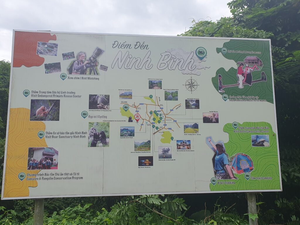 Heute stand eine „Tagestour“ an, d.h. mehr als vier Stunden unterwegs sein. Die Fahrt zum NP dauert durch aufkeimende Reisfelder etwa eine Stunde. Angekommen treffen wir die Führerin, Tschung, vor dem Parkeingang. Der NP ist der älteste Vietnams und noch von Ho Chi Minh gegründet. Er erstreckt sich über drei Provinzen und ist damit viel zu groß, um ihn genauer kennen zu lernen. Hier werden auch Conservation Centers für gefährdete Tierarten Vietnams betrieben (Primaten, Schildkröten, …), deren Ziel der Erhalt und die schrittweise Auswilderung der geretteten Tiere ist. Die Führerin erzählt uns viel vom illegalen Handel und Besitz verschiedener Tierarten, der v.a. aus traditionellem Glauben an die medizinische Wirkung des Essens einzelner Tierteile – z.B. Affengehirn für mehr Intelligenz – motiviert wird. Sehr viele Abnehmer kommen aus China; auch tierische Wertgegenstände wir das Horn von Nashörnern werden via Vietnam nach China geschmuggelt. Außerdem erzählt sich auch von unstimmigen Gesetzen bzgl. des Besitzes und des Handels geschützter Tierarten. Alles sehr interessant!