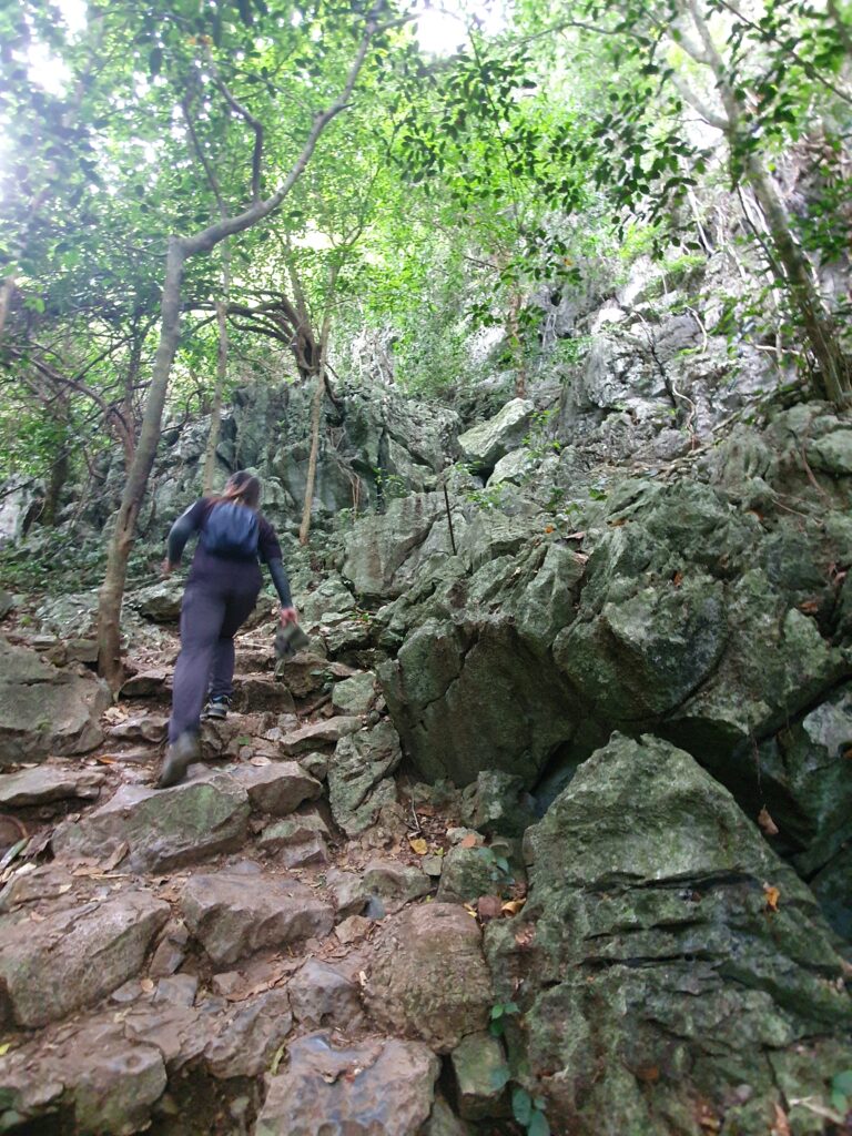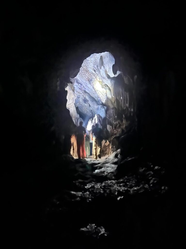 Nächster Stop ist eine Hölle, in der man prähistorische Gräber mit sitzenden Menschen gefunden hat. Die sind selbstverständlich ins Museum verbracht, doch die Höhle ist selbst sehr beeindruckend (Fledermäuse, Stalaktiten und Stalakmiten, die zusammenwachsen, Felsformationen, Tropfen von Wasser, silberfarbige Streifen aufgrund auskristalisiertem Karbonat?). Beängstigend wird es v.a. dann, wenn die Guides die Taschenlampen ausschalten… Nachdem wir ohne Unfälle wieder draußen standen, stiegen wir die knapp 200 Stufen wieder hinab und kehrten zum Auto zurück. Aufgrund der Weitläufigkeit müssen die Zwischenstrecken mit ihm zurückgelegt werden – was übrigens auch dauert.
