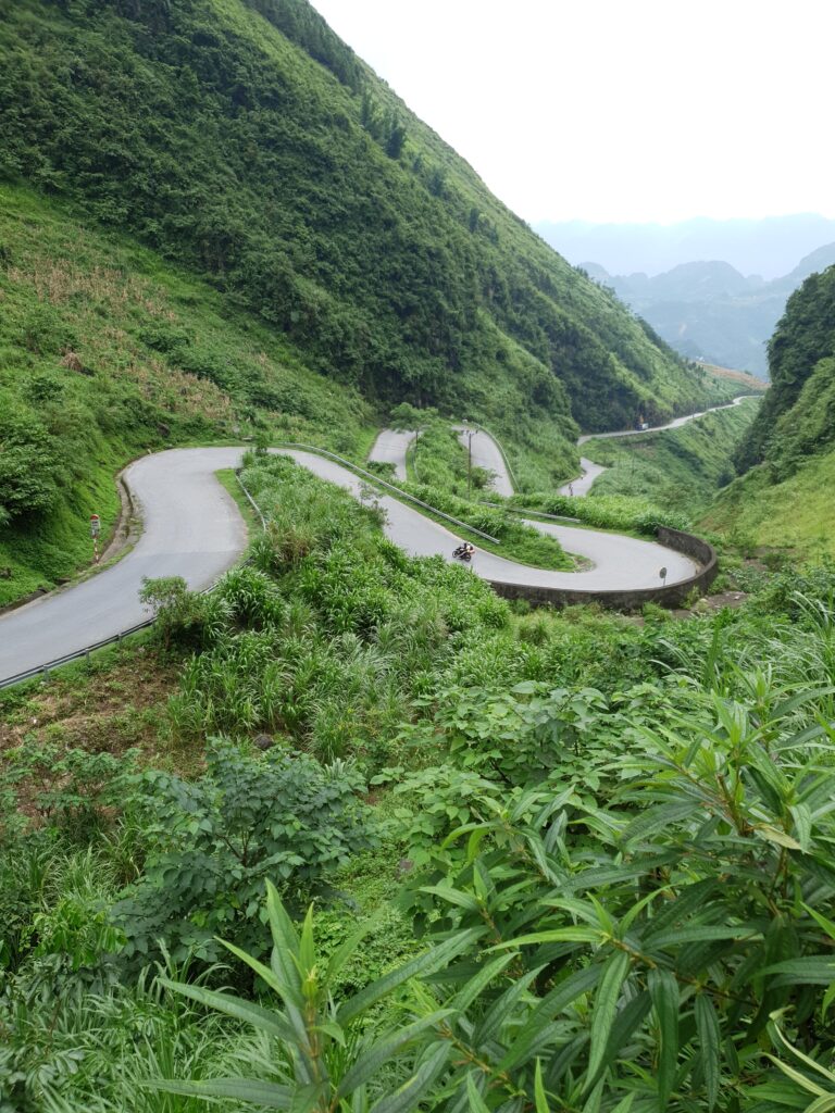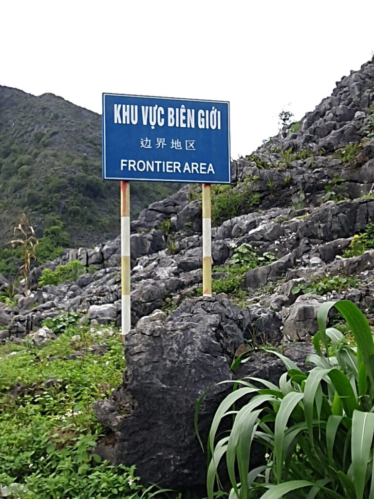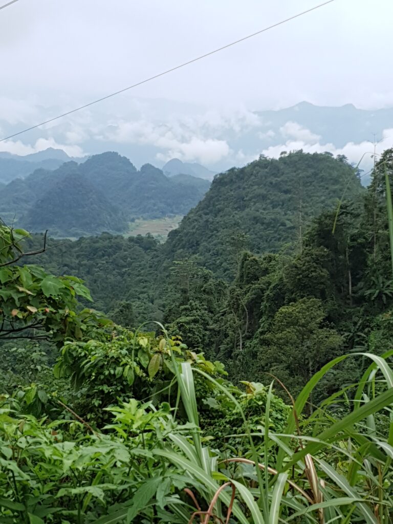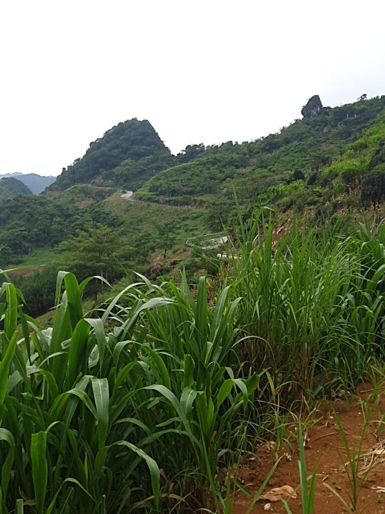 Die Landschaft ist beeindruckend. Mal sind die Hügel sehr bewaldet, wahrscheinlich wäre dschungelartig die bessere Bezeichnung. Mal sind die Kuppen felsig, wobei es zwischen schieferartig und blockartig wechselt. Bis hoch in unwegsames Terrain bauen die Menschen hier Mais an, das dominante Nahrungsmittel. Jede noch so kleine potentielle Nutzfläche wird auch genutzt. Reisfelder gibt es auch, aber eben nur an den weniger steilen Hängen. In der ganzen Provinz leben nur etwa 50.000 Menschen, so viel wie schon allein in Ha Giang City. Die Kleidung variiert stark, da es sich offensichtlich um verschiedene Ethnien bzw. Traditionen handelt. Die meisten leben schon aufgrund mangelnder Infrastruktur sehr abgeschieden und mischen sich vielleicht auch deshalb nicht so sehr. Allerdings sind auch in diesen Örtchen genug Smartphones zu finden. Selbst bei einem Stelldichein außerhalb des Ortes sah ich die beiden mehr mit ihrem Phone als miteinander beschäftigt. Grundsätzlich fallen die vielen Kinder auf, die auch auf den Feldern zu sehen. Mein Guide, Ket, beschreibt den Teufelskreis so: Viele Kinder, wenig Bildung (da teuer und Arbeitskraft gebraucht wird), frühe Heirat mit 15/16 Jahren, noch mehr Kinder. Das Problem jeder Agrarkultur, zumal die Felder für die immer größer werdenden Familien nicht ertragreich genug sind.