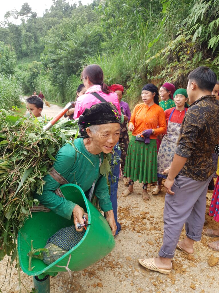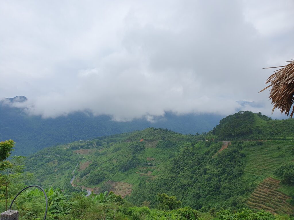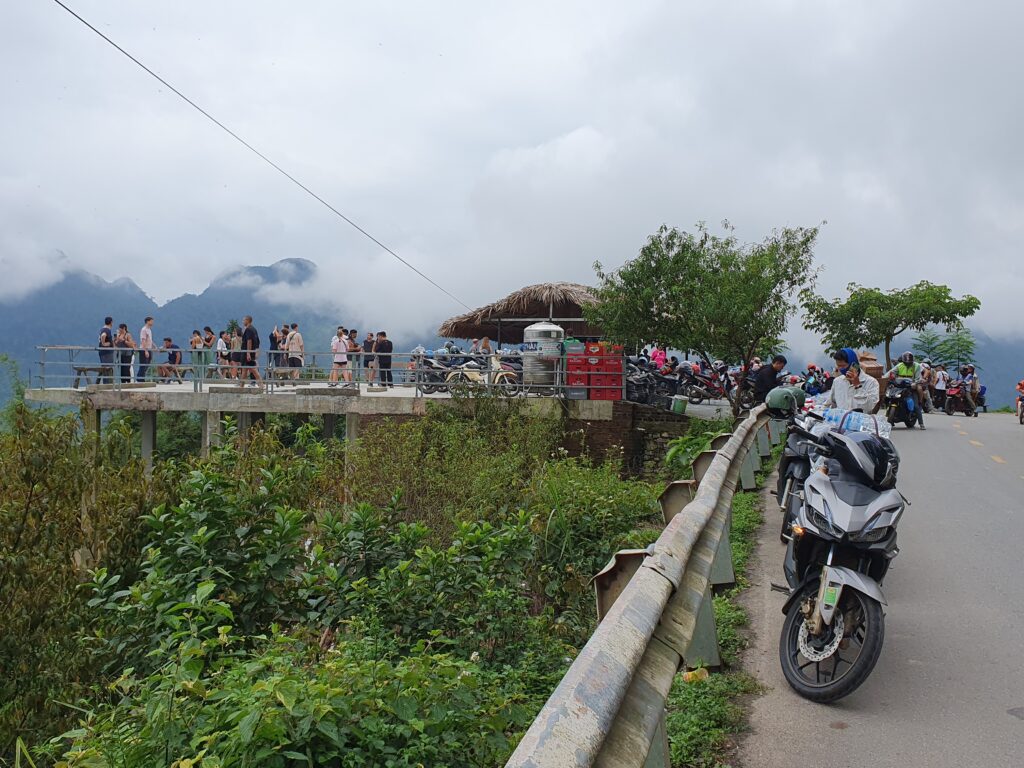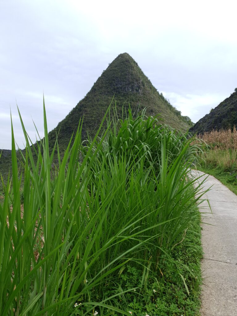 Die Landschaft ist beeindruckend. Mal sind die Hügel sehr bewaldet, wahrscheinlich wäre dschungelartig die bessere Bezeichnung. Mal sind die Kuppen felsig, wobei es zwischen schieferartig und blockartig wechselt. Bis hoch in unwegsames Terrain bauen die Menschen hier Mais an, das dominante Nahrungsmittel. Jede noch so kleine potentielle Nutzfläche wird auch genutzt. Reisfelder gibt es auch, aber eben nur an den weniger steilen Hängen. In der ganzen Provinz leben nur etwa 50.000 Menschen, so viel wie schon allein in Ha Giang City. Die Kleidung variiert stark, da es sich offensichtlich um verschiedene Ethnien bzw. Traditionen handelt. Die meisten leben schon aufgrund mangelnder Infrastruktur sehr abgeschieden und mischen sich vielleicht auch deshalb nicht so sehr. Allerdings sind auch in diesen Örtchen genug Smartphones zu finden. Selbst bei einem Stelldichein außerhalb des Ortes sah ich die beiden mehr mit ihrem Phone als miteinander beschäftigt. Grundsätzlich fallen die vielen Kinder auf, die auch auf den Feldern zu sehen. Mein Guide, Ket, beschreibt den Teufelskreis so: Viele Kinder, wenig Bildung (da teuer und Arbeitskraft gebraucht wird), frühe Heirat mit 15/16 Jahren, noch mehr Kinder. Das Problem jeder Agrarkultur, zumal die Felder für die immer größer werdenden Familien nicht ertragreich genug sind.